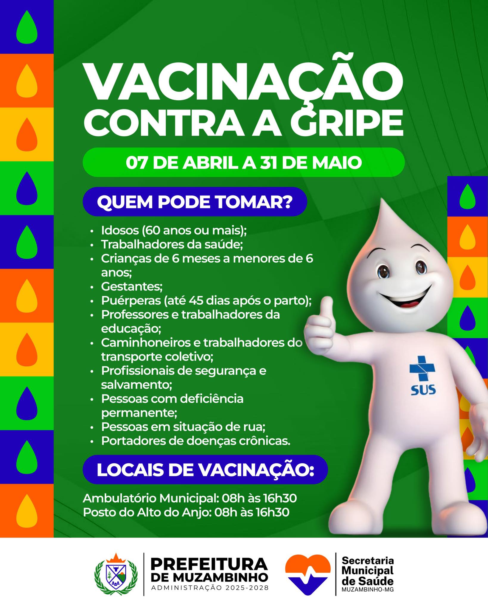 A Prefeitura Municipal de Muzambinho, por meio da Secretaria Municipal de Saúde, dará início à Campanha de Vacinação contra a Influenza de 2025 no próximo dia 07 de abril. A iniciativa visa imunizar os grupos prioritários e garantir proteção contra o vírus da gripe.