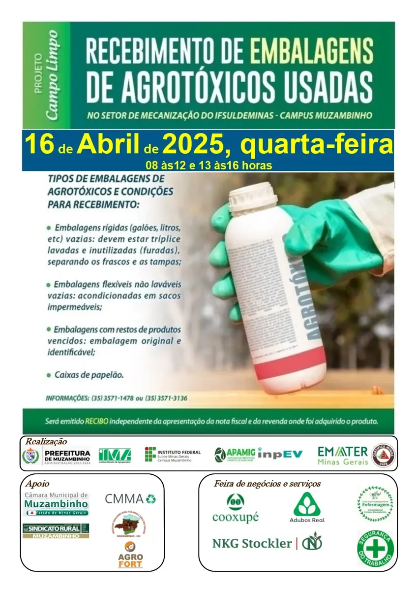 Acontece no dia 16 de abril de 2025 (quarta-feira) a etapa 1/2025 do Projeto Campo Limpo, que tem como objetivo promover o recolhimento e a destinação correta de embalagens de agrotóxicos utilizadas nas propriedades rurais da região. A ação será realizada no Setor de Mecanização do IFSULDEMINAS – Campus Muzambinho, das 08h às 12h e das 13h às 16h.