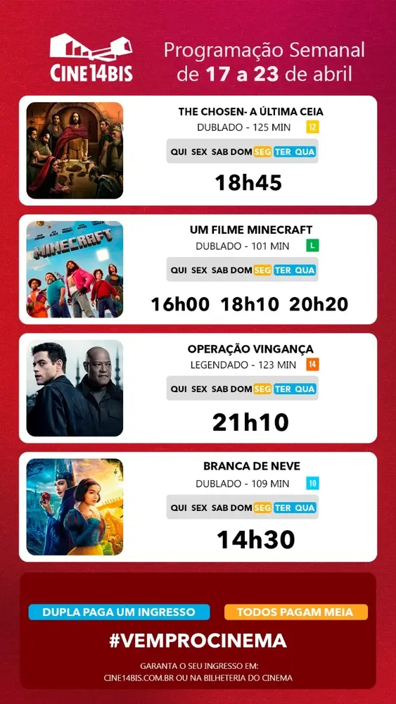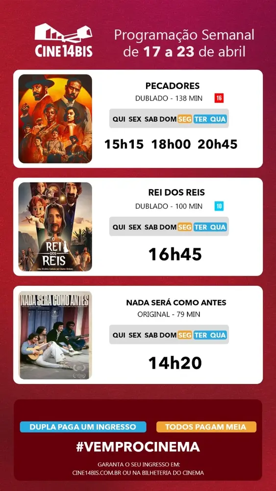 - Pecadores (Estreia): Dirigido por Ryan Coogler, conhecido por “Pantera Negra” e “Creed”, este thriller sobrenatural ambientado nos anos 1930 acompanha os irmãos gêmeos Smoke e Stack (interpretados por Michael B. Jordan) que retornam à sua cidade natal para recomeçar suas vidas. No entanto, eles se deparam com uma força maligna que ameaça a comunidade local. O filme combina elementos de drama histórico, música e terror, oferecendo uma experiência cinematográfica única. O Cine14Bis segue sendo referência de conforto, qualidade e tecnologia na região, com três salas equipadas com projeção de ponta, poltronas VIPs e bomboniere completa. É a escolha ideal para quem quer aproveitar o feriado com cultura, lazer e muita emoção.