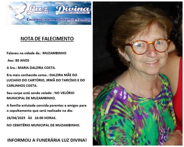 Mais Artigos DestaqueDiversosNossa Cidade Coleta de lixo terá horários especiais durante o Muzafolia 2026 em Muzambinho CulturaDestaqueEventos e FestasNossa Cidade Muzafolia 2026 começa com tradição e animação na Avenida Dr. Américo Luz Cozinha e CulináriaDestaqueNossa CidadeParceiros Chame os amigos e aproveite o Carnaval com todo o sabor dos Queijos Musa!DestaqueObituárioFaleceu aos 80 anos a Sra. Maria Dalzira Costa Redação26 de abril de 20251min0Informou a Funerária Luz DivinaA família enlutada, nossos sinceros sentimentos de pesares, que Deus os abençoe e conforte. Post Views: 1.229EnterroFuneráriaLuz DivinamorteobituárioSepultamentoVelório