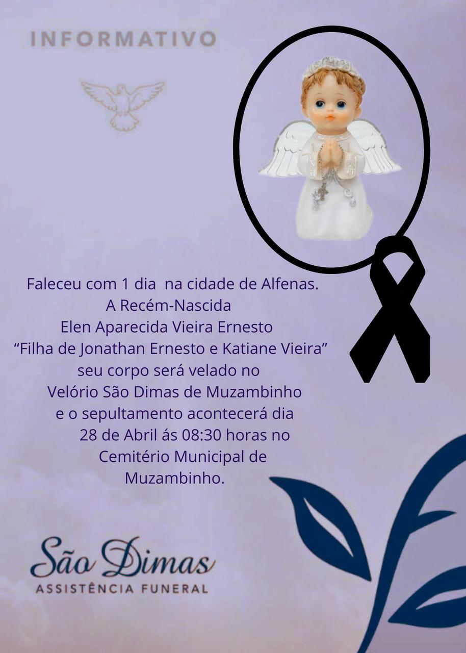 Mais Artigos DestaqueEducaçãoNossa Cidade Formatura e II Cantata de Natal encantam público em noite de celebração no Colégio N.S. Bom Conselho DestaqueEventos e FestasNossa CidadeParceiros ObaOba Samba House reúne centenas de pessoas em noite de muita música no Sagrada Família DestaqueObituário Faleceu aos 68 anos o Sr. Antônio Vitor da SilvaDestaqueObituárioFaleceu com 1 dia vida Elen Aparecida Vieira Ernesto Redação27 de abril de 20251min0Informou a Funerária São DimasCom pesar, a Funerária São Dimas informa o falecimento e solidariza-se com os familiares, expressando os mais sinceros sentimentos de pesar. Que Deus os abençoe e conforte.Informou a Funerária São Dimas Post Views: 860EnterroFuneráriamorteobituárioSão DimasSepultamentoVelório