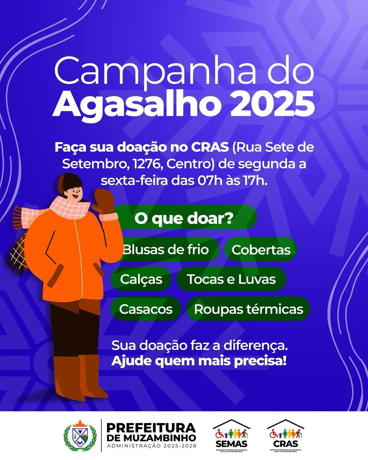 A Prefeitura de Muzambinho, por meio da Secretaria Municipal de Assistência Social e do Centro de Referência da Assistência Social (CRAS), deu início à Campanha do Agasalho 2025, com o objetivo de arrecadar roupas e itens de inverno que serão distribuídos a famílias em situação de vulnerabilidade social no município.