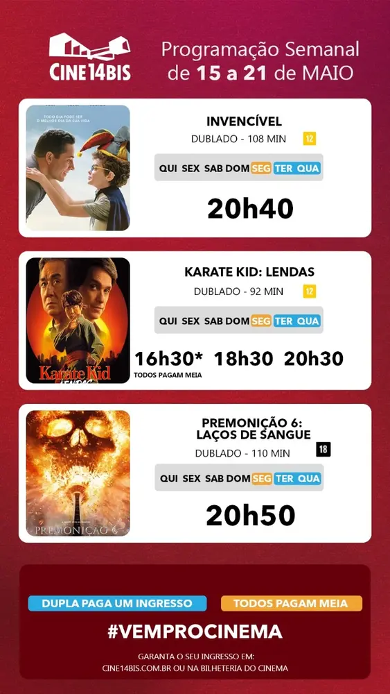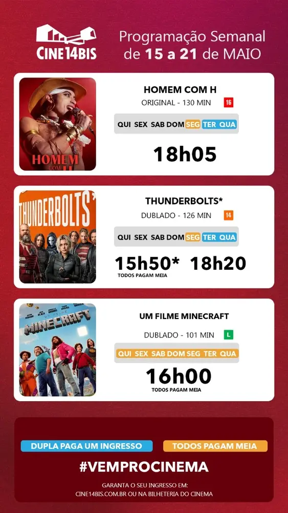 Garanta seu ingresso pelo site ou app do Cine14Bis. É fácil, prático e evita filas.