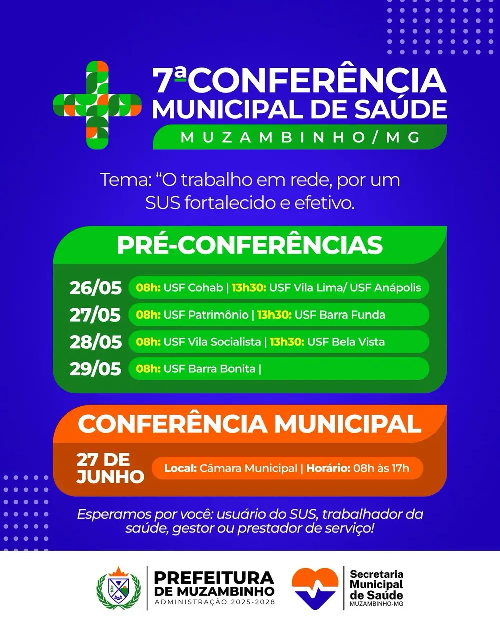 A Prefeitura de Muzambinho, por meio da Secretaria Municipal de Saúde, convida toda a população para participar da 7ª Conferência Municipal de Saúde, que será realizada no dia 27 de junho, das 08h às 17h, na Câmara Municipal. O evento é um importante espaço democrático de discussão, onde cidadãos, profissionais de saúde, gestores e prestadores de serviços se reúnem para avaliar, propor e deliberar melhorias nas políticas públicas de saúde.