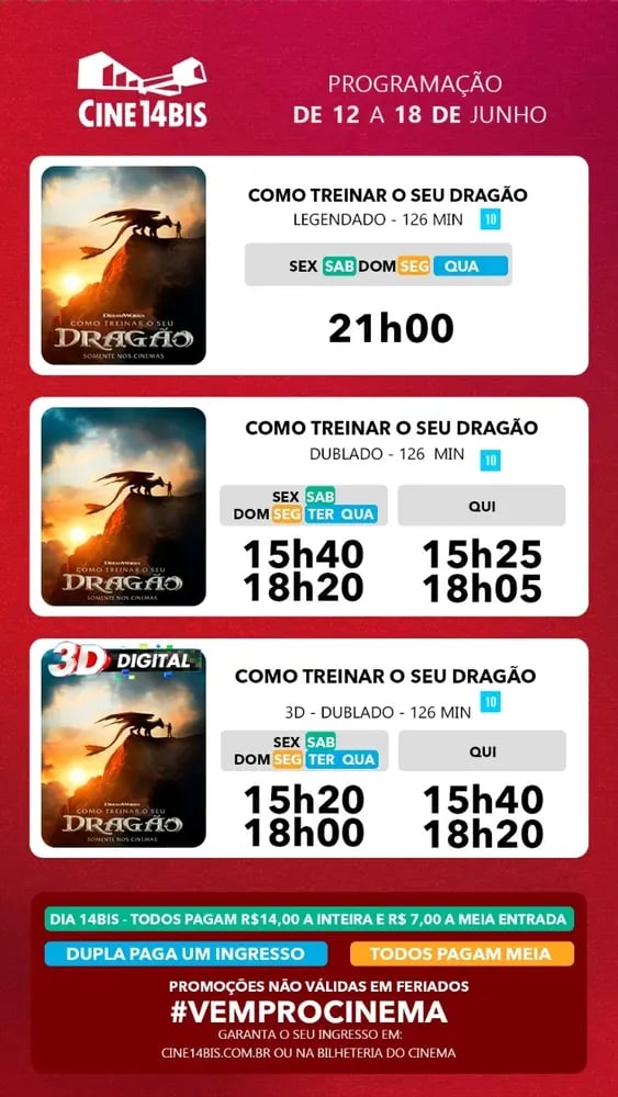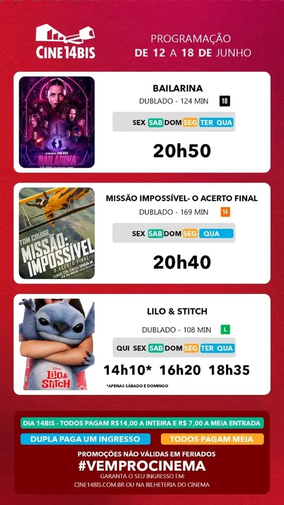 A promoção especial garante ingressos a R$ 14,00 (inteira) e R$ 7,00 (meia-entrada) em todas as sessões, inclusive nas poltronas VIPs — uma oportunidade única para aproveitar o melhor do cinema com conforto, tecnologia e economia. A campanha, que acontece todo dia 14 de cada mês, é válida para todo o público, sem restrições