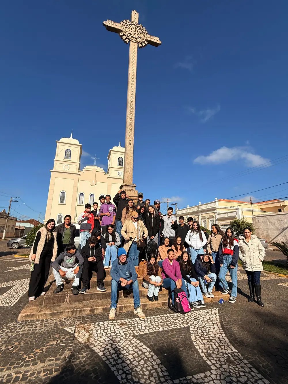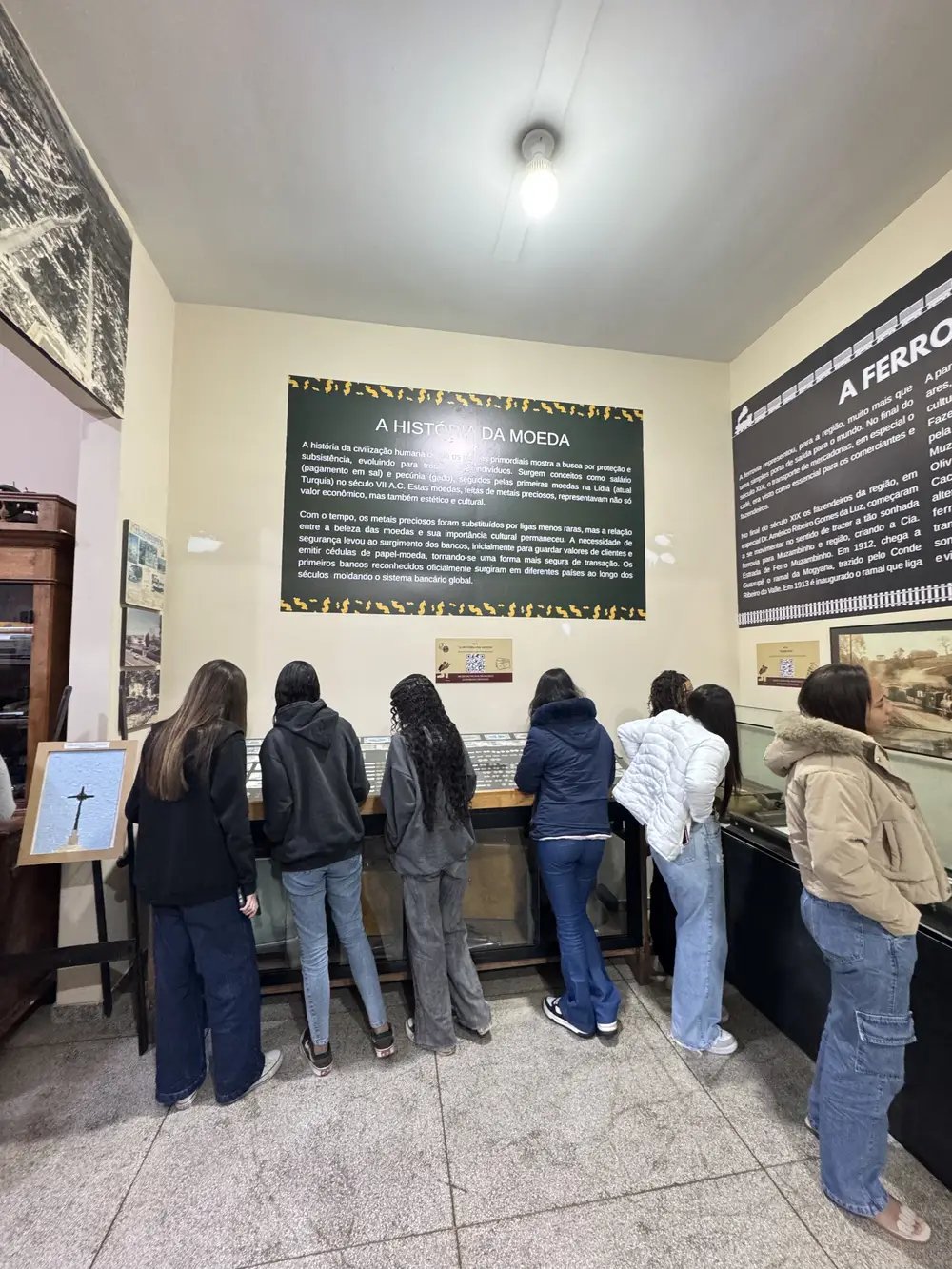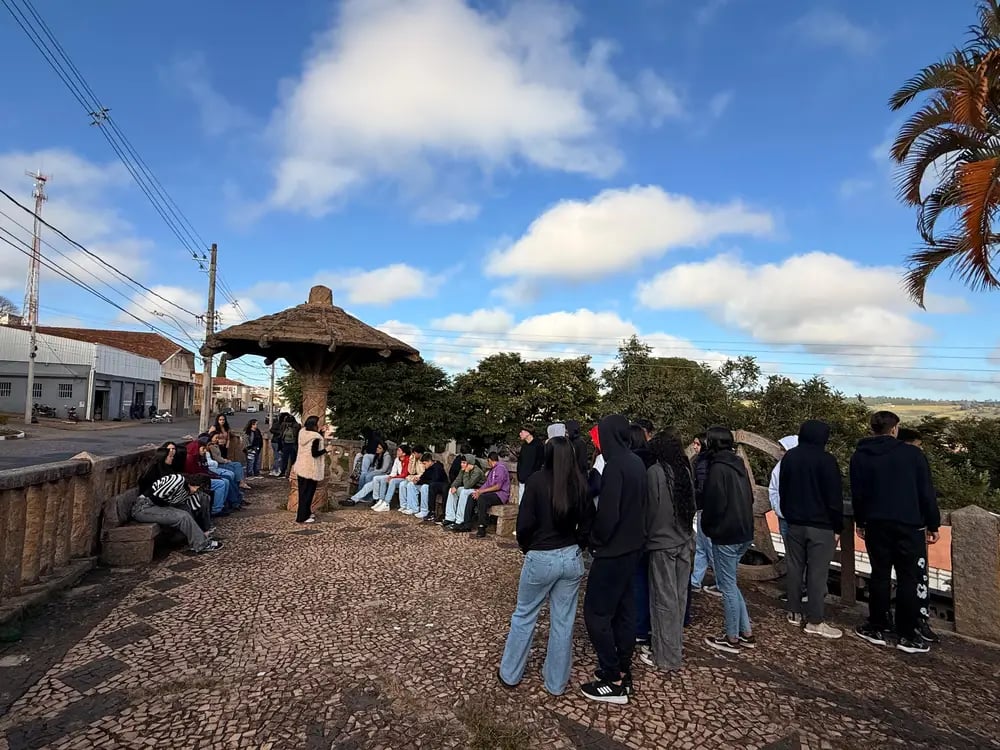O grupo seguiu para o Chapéu de Sol, patrimônio tombado, conheceu a história da antiga estação ferroviária e visitou a Casa da Cultura, encantando-se com a Sala Milton Neves. O trajeto continuou pela Rua Tiradentes, onde os alunos observaram fachadas históricas e conheceram o Cruzeiro de Pedras, finalizando o passeio na Casa do Artesão, com destaque para a produção artesanal e o papel da economia criativa local.