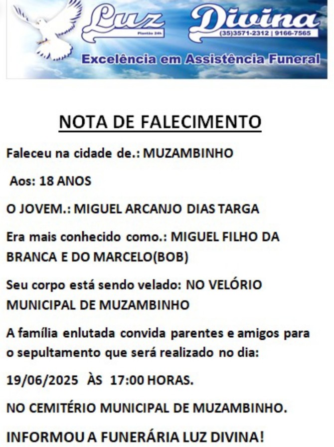 Mais Artigos DestaqueDiversosNossa CidadeNosso Estado Banda Municipal Santa Cecília se apresenta no Tribunal de Contas de Minas Gerais DestaqueObituário Faleceu aos 65 anos a Sra. Denise Aparecida Ribeiro Figueiredo DestaqueObituário Faleceu aos 77 anos a Sra. Marina de Jesus SilvaDestaqueObituárioFaleceu aos 18 anos Miguel Arcanjo Dias Targa (Filho da “Branca”) Redação19 de junho de 20251min0Informou a Funerária Luz DivinaA família enlutada, nossos sinceros sentimentos de pesares, que Deus os abençoe e conforte. Post Views: 1.523EnterroFuneráriaLuz DivinamorteobituárioSepultamentoVelório