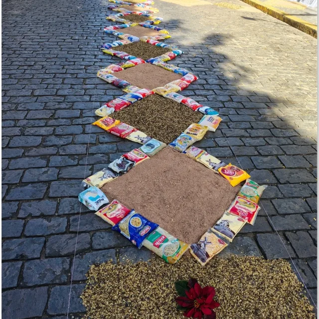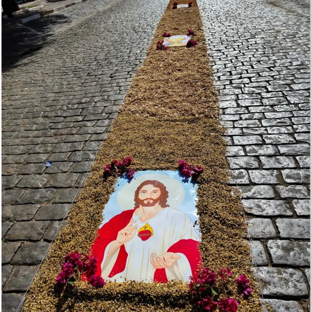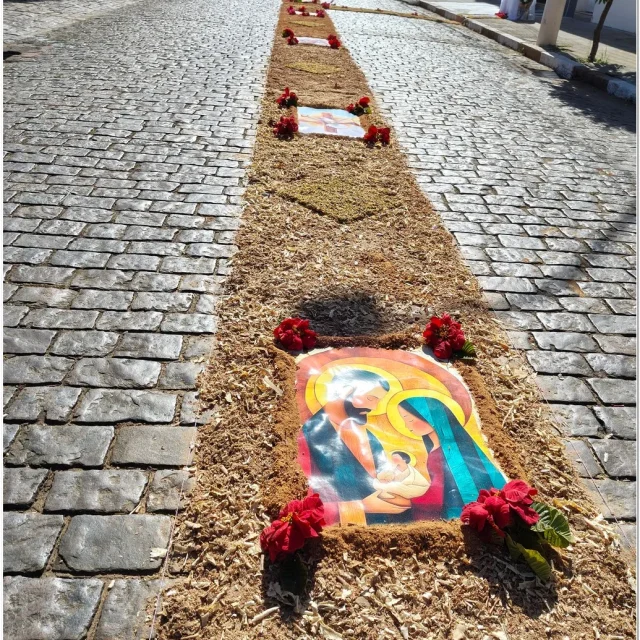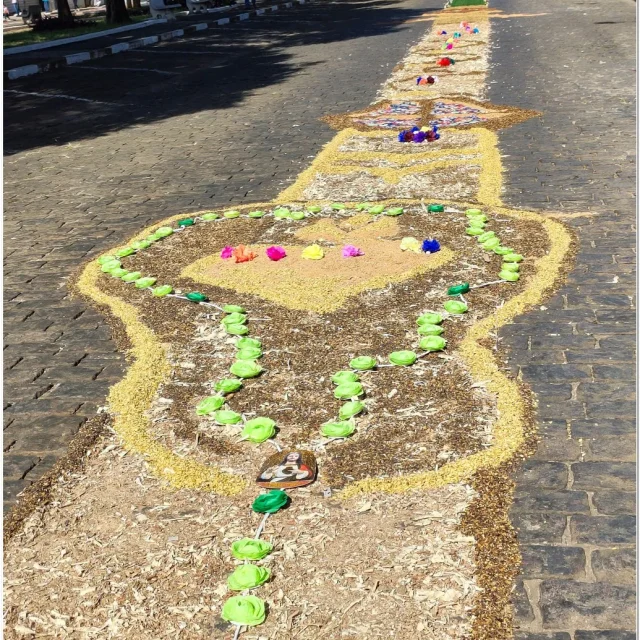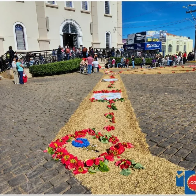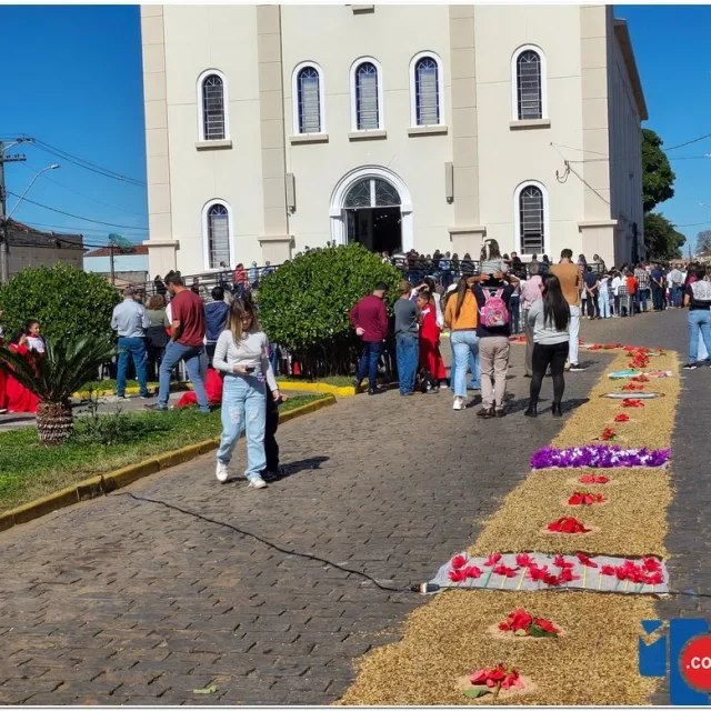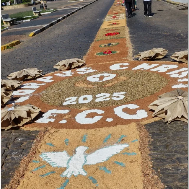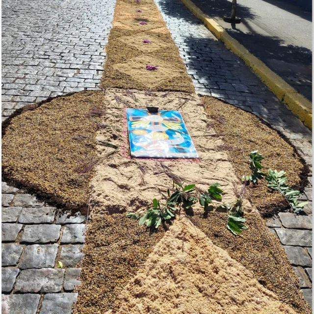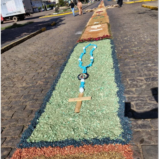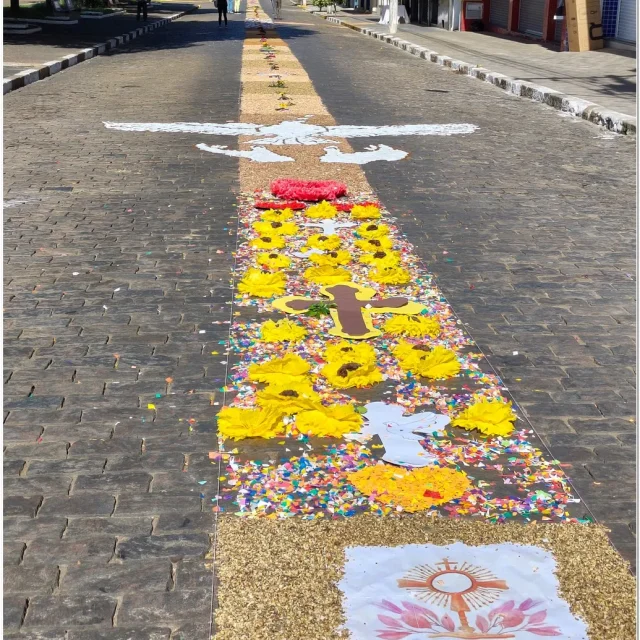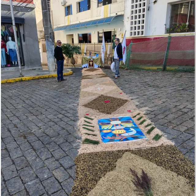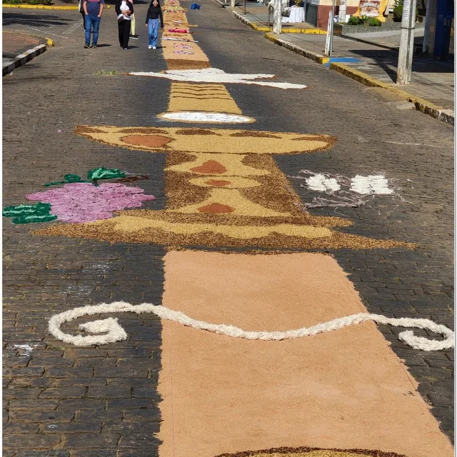 Após a Santa Missa celebrada na Igreja Matriz São José, os fiéis se reuniram para acompanhar a procissão do Santíssimo Sacramento, conduzida pelo sacerdote em meio a orações, cânticos e um clima de profunda espiritualidade. A caminhada foi feita sobre os tapetes confeccionados com serragem colorida, flores, sal, pó de café, folhas, alimentos e outros materiais, formando desenhos que representavam símbolos e passagens da fé cristã.