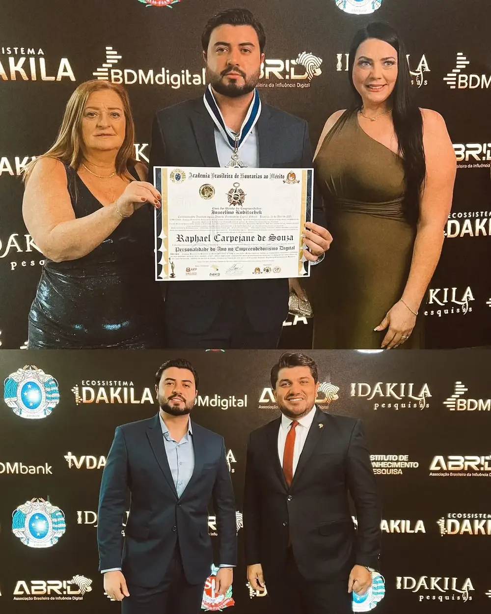 A homenagem foi entregue pelo Comendador Regino Barros, presidente da academia, que destacou a visão estratégica e o impacto do trabalho de Raphael no cenário digital brasileiro. A solenidade também foi marcada pela presença de familiares, entre eles a mãe do homenageado, Denise Carpejane, servidora pública da Prefeitura de Muzambinho. “É um orgulho imenso para nossa família. Ver o trabalho do meu filho ser reconhecido nacionalmente, ele tão jovem, é uma emoção muito grande. Muzambinho agora tem dois premiados com essa honraria: o primeiro foi Milton Neves, e agora o Raphael”, afirmou.