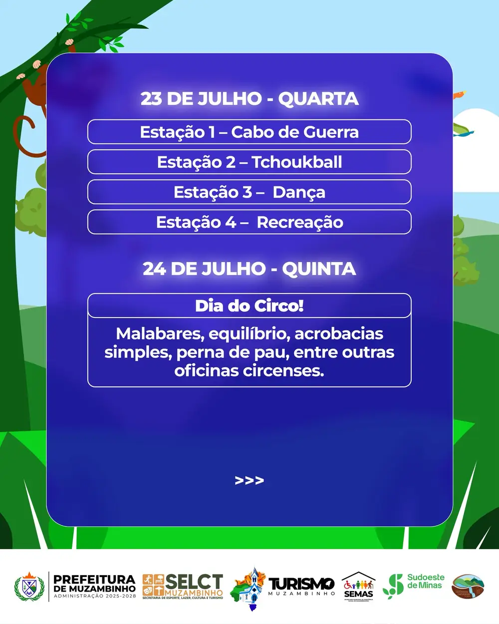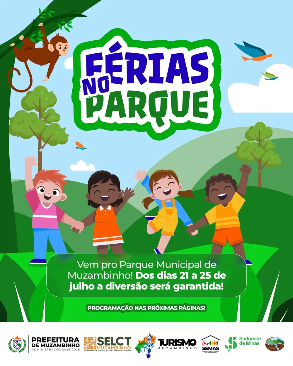 A Prefeitura de Muzambinho está preparando uma semana pra lá de especial para a criançada neste mês de julho. Entre os dias 21 e 25, o Parque Municipal Carolina Pereira Bernardes Anderson será palco do evento “Férias no Parque”, com uma programação gratuita recheada de atividades culturais, esportivas e recreativas, tudo pensado para garantir muita alegria durante o recesso escolar.