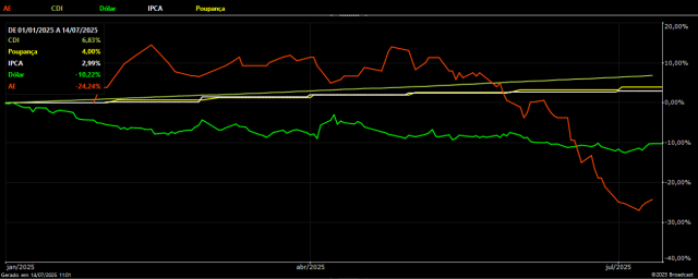 A seguir, apresentamos um estudo comparativo entre o desempenho do preço físico do café arábica (AE) negociado em Guaxupé/MG desde o início do ano e alguns benchmarks do mercado financeiro. Os dados indicam que, enquanto o café acumulou uma desvalorização superior a 20% no período, investimentos atrelados ao CDI registraram rentabilidade positiva, com tendência de alcançar níveis ainda mais elevados até o final de 2025. Esse contraste evidencia a importância da gestão de riscos por parte dos produtores, ressaltando a diversificação das reservas financeiras como uma estratégia fundamental para proteger o patrimônio e garantir maior estabilidade diante das oscilações do mercado.