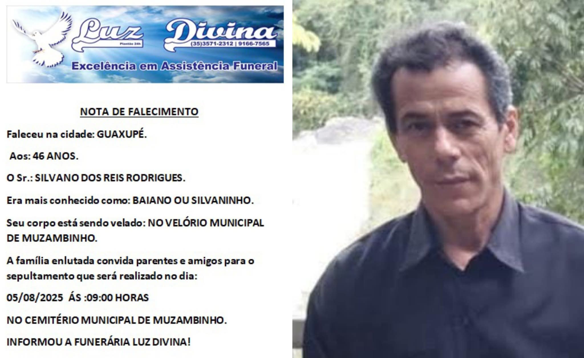 Mais Artigos DestaqueNossa CidadeReligião 21ª Marcha para Jesus será realizada em Muzambinho no dia 6 de dezembro DestaqueObituário Faleceu aos 70 anos o Sr. Lázaro Pereira DestaqueEsportesNossa Cidade Corredor muzambinhense brilha e vence prova noturna em Caldas DestaqueObituárioFaleceu aos 46 anos o Sr. Silvano dos Reis Rodrigues Redação4 de agosto de 20251min0Informou a Funerária Luz Divina A família enlutada, nossos sinceros sentimentos de pesares, que Deus os abençoe e conforte. Post Views: 197 EnterroFuneráriaLuz DivinamorteobituárioSepultamentoVelório