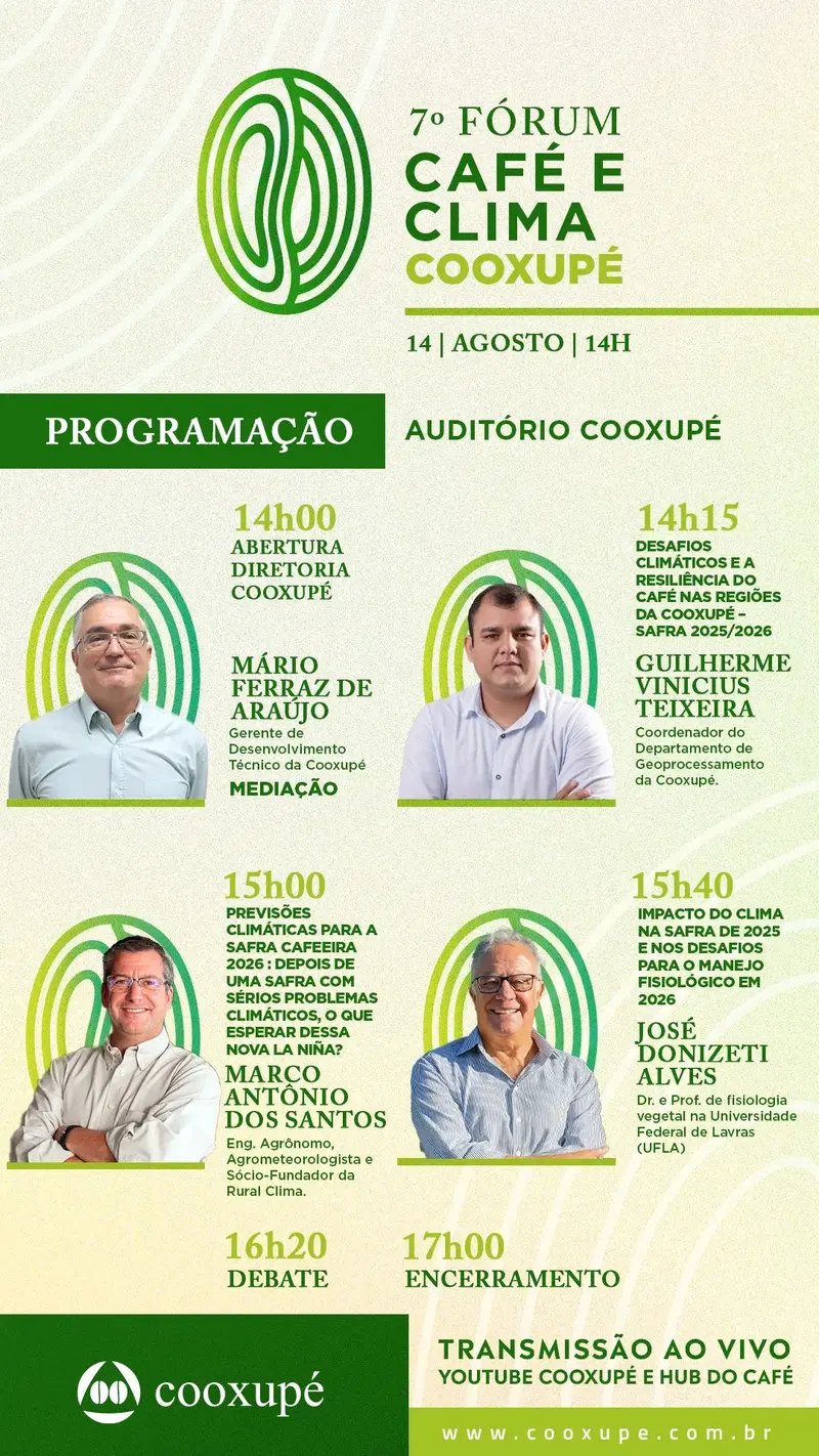 Dentre os palestrantes estão Guilherme Vinícius Teixeira, engenheiro agrônomo e coordenador de Geoprocessamento da Cooxupé. Ele abordará os desafios climáticos e a resiliência do café na área de atuação da cooperativa, que compreende mais de 360 municípios, com análise da safra 2025/2026.
