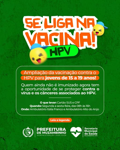 A Prefeitura de Muzambinho, por meio da Secretaria Municipal de Saúde, anunciou a ampliação da faixa etária para vacinação contra o HPV. Agora, jovens entre 15 e 19 anos que ainda não foram imunizados podem receber a vacina gratuitamente no município.