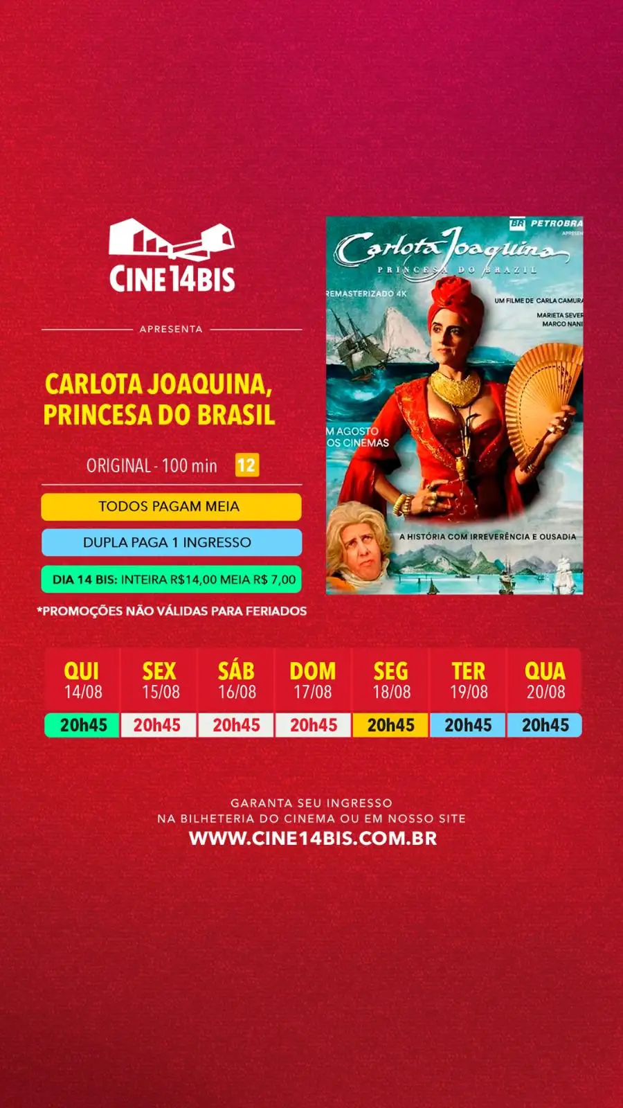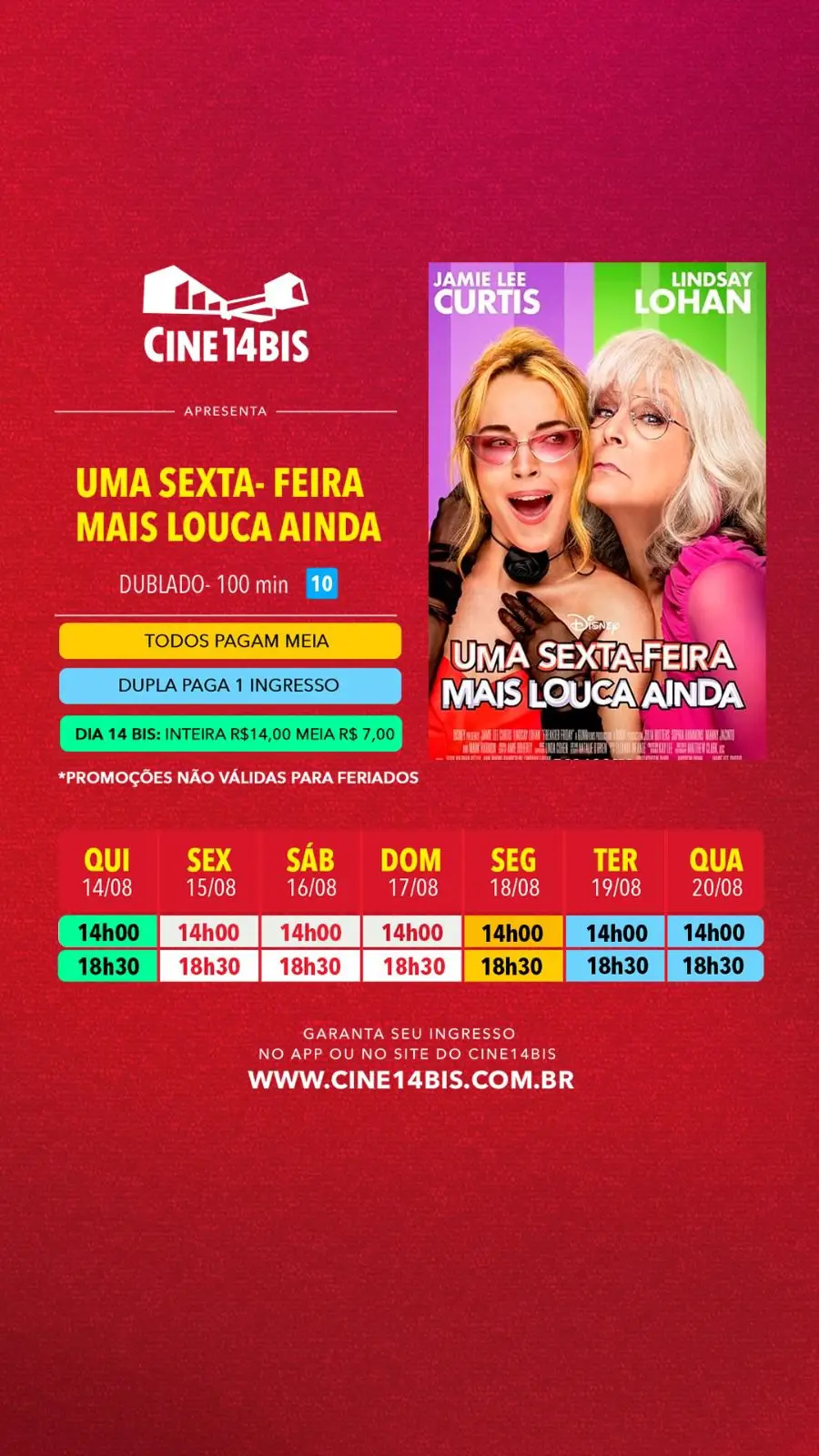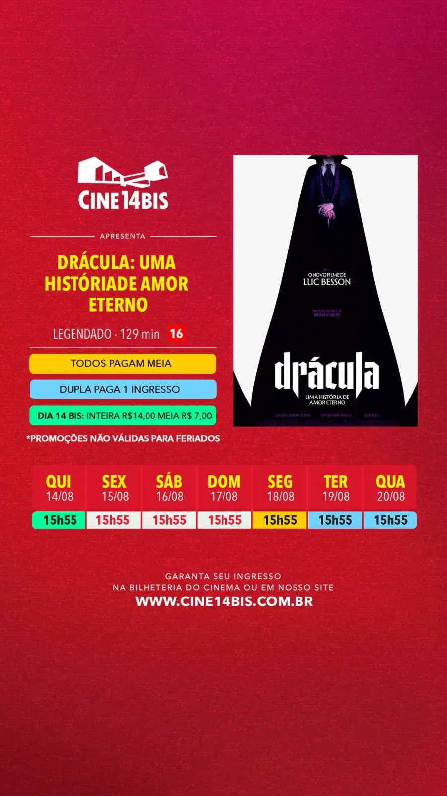 No dia 14 de cada mês, todos pagam R$14,00 na inteira e R$7,00 na meia. Aproveite!
