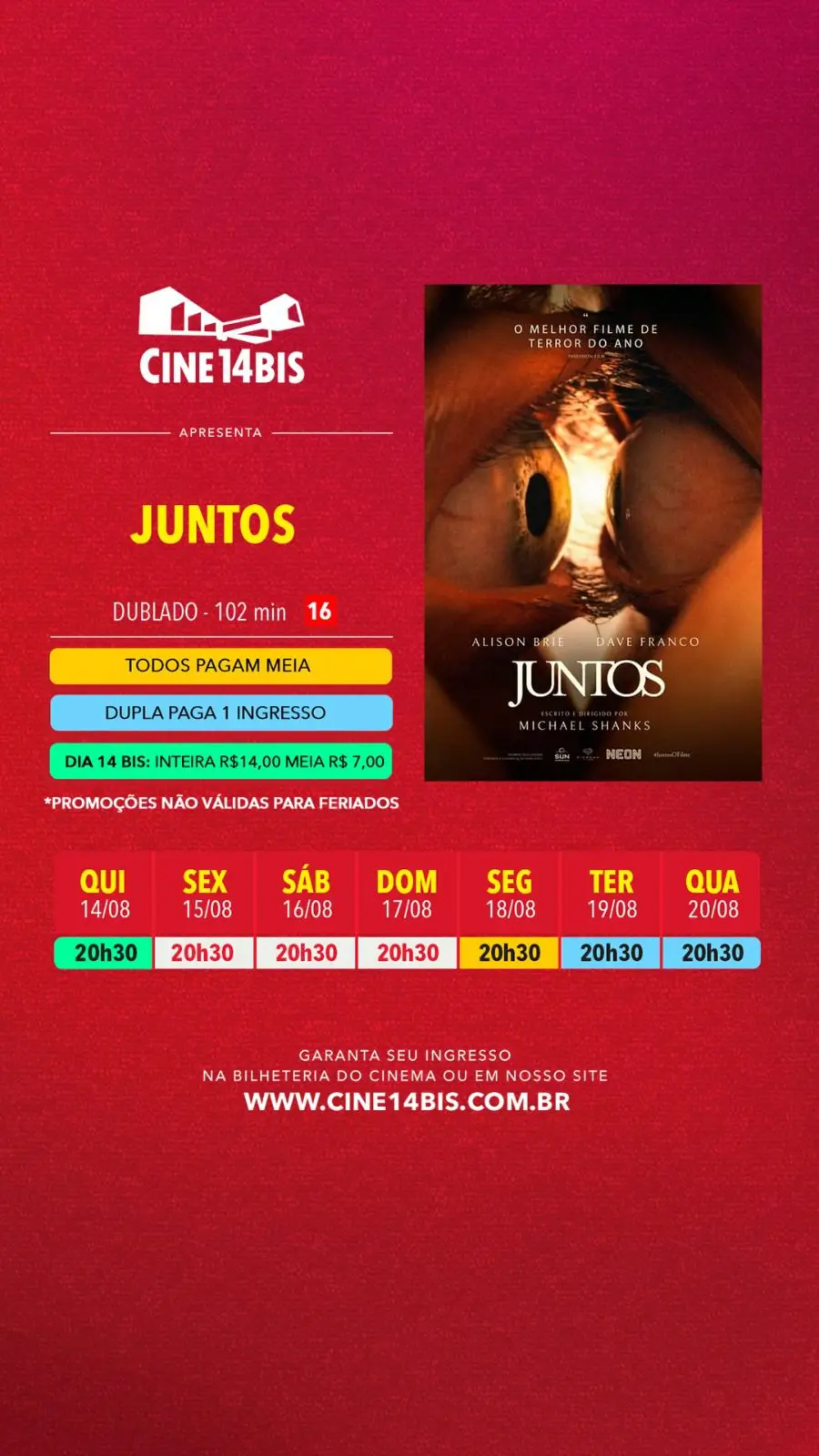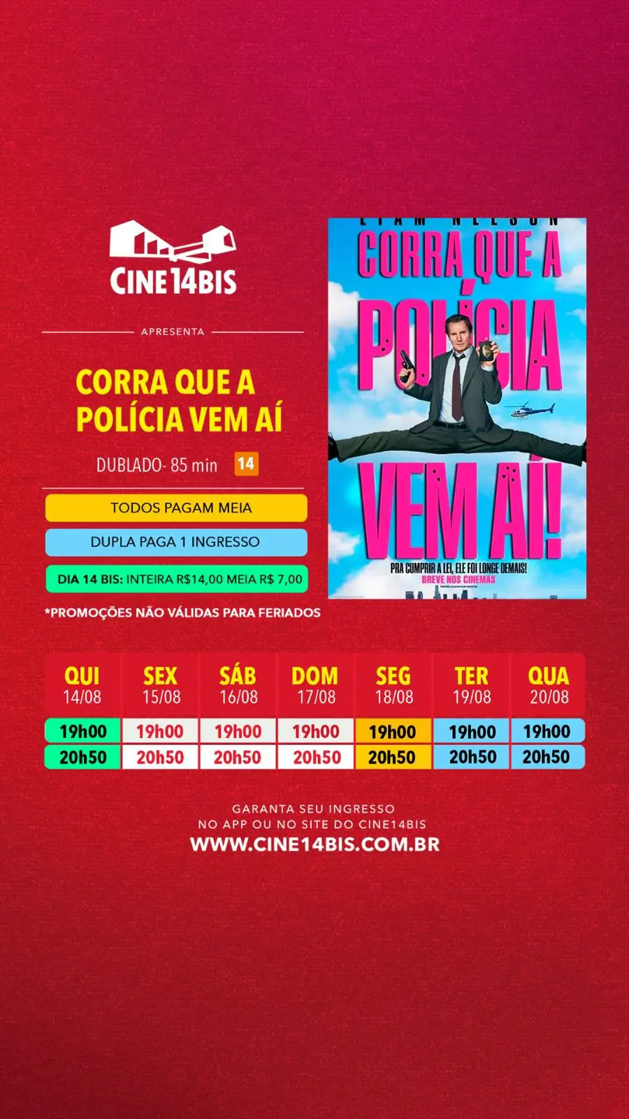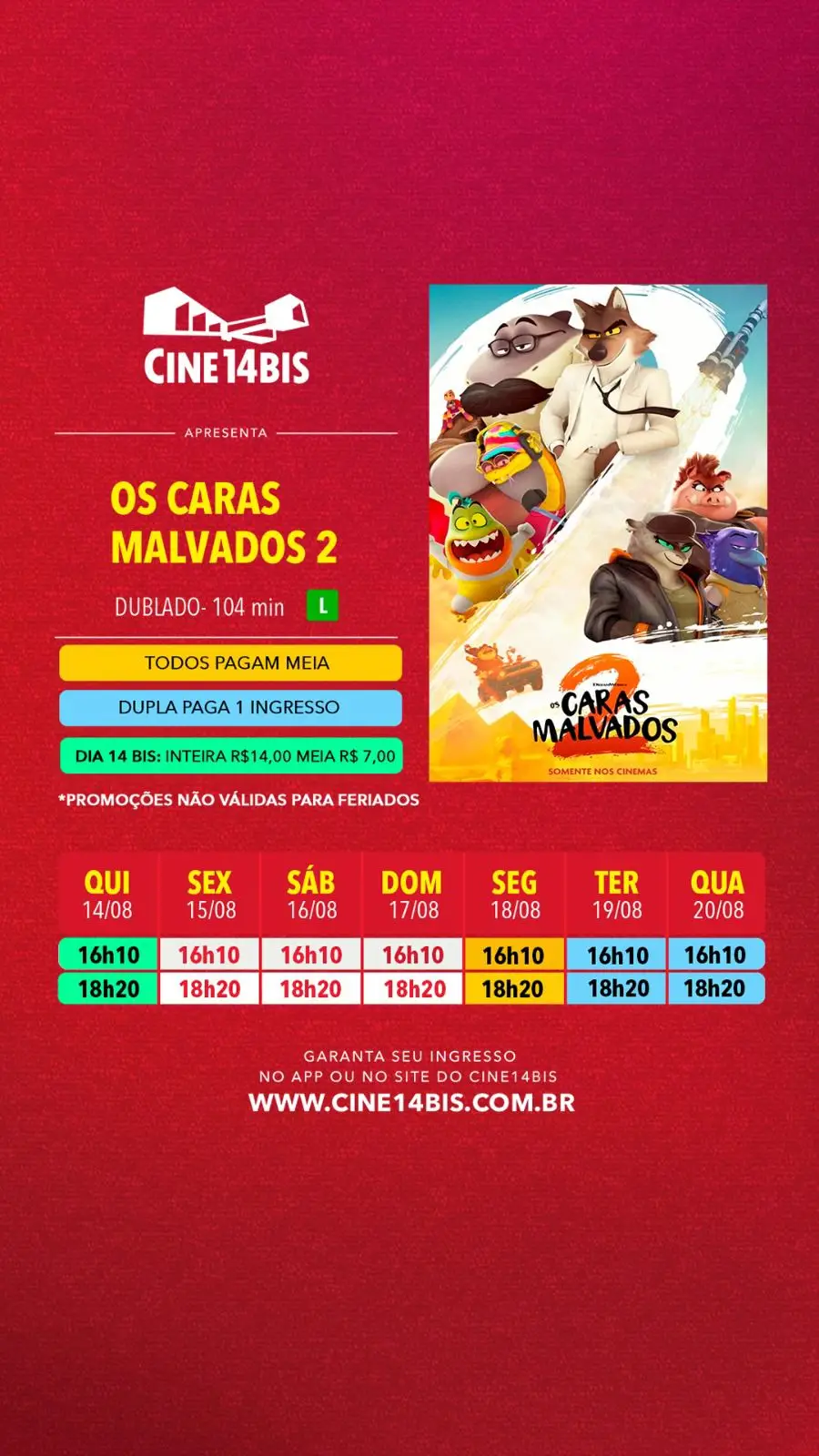 No dia 14 de cada mês, todos pagam R$14,00 na inteira e R$7,00 na meia. Aproveite!