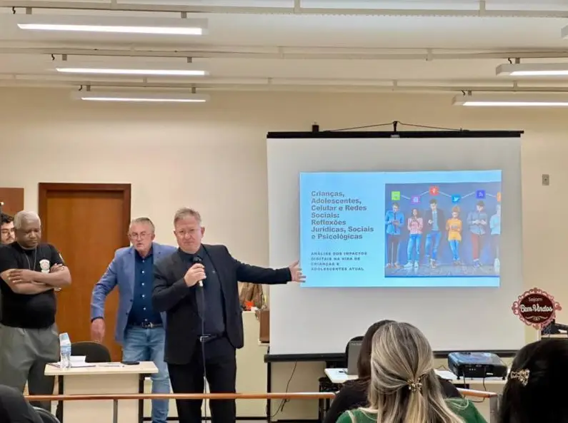 O juiz titular da Comarca de Muzambinho, Dr. Flávio Umberto Schimdt falou a respeito da importância de se fortalecer os núcleos familiares, retirando as mídias sociais do alcance das crianças e da preocupação que os pais devem ter na diferenciação das redes sociais usadas pelos filhos nas várias idades.