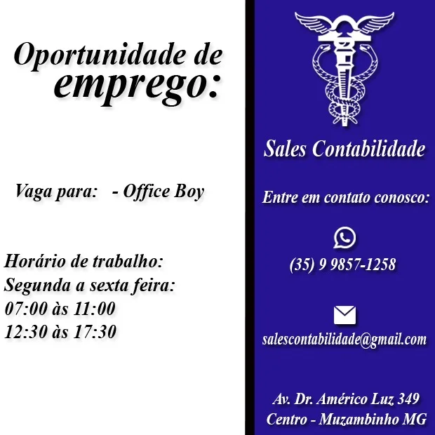 A Sales Contabilidade, tradicional empresa de contabilidade em Muzambinho, está com uma nova oportunidade de emprego para o cargo de Office Boy.