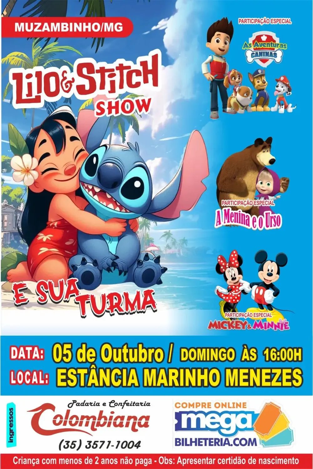 No domingo, 05 de outubro, às 16h, acontece o Show Lilo & Stitch e sua Turma, uma apresentação teatral cheia de música, cores e diversão.