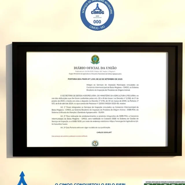 Nesta quarta-feira (24), o Consórcio Intermunicipal da Baixa Mogiana (CIMOG) e a Associação dos Municípios da Microrregião da Baixa Mogiana (AMOG) viveram um marco histórico: o Serviço de Inspeção Municipal (SIM CIMOG) recebeu oficialmente a equivalência ao Sistema Brasileiro de Inspeção de Produtos de Origem Animal (SISBI-POA).