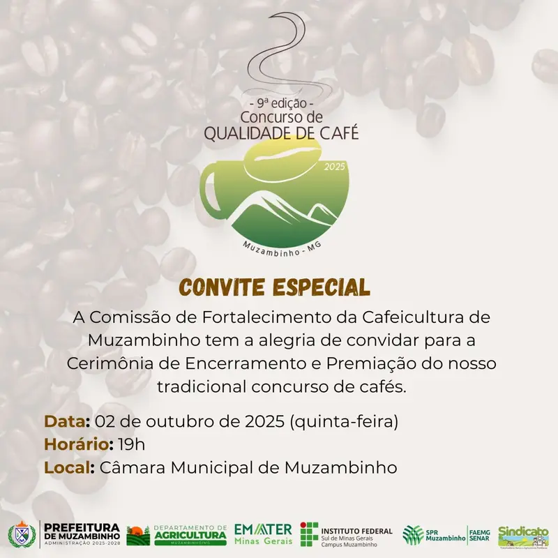 A Comissão de Fortalecimento da Cafeicultura convida todos os produtores e a população para prestigiar a cerimônia, que celebra não apenas os vencedores, mas toda a força e dedicação da cafeicultura muzambinhense.