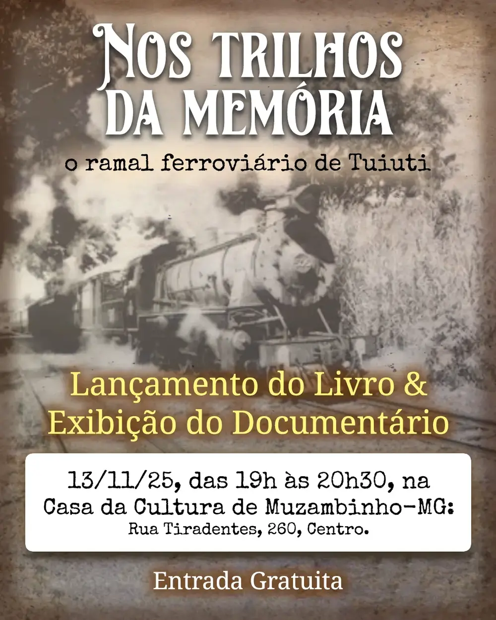 Na quinta-feira, 13 de novembro, Muzambinho será palco de um evento cultural que promete emocionar moradores e amantes da história ferroviária do Sul de Minas. O escritor lança o livro “Nos Trilhos da Memória – o ramal ferroviário de Tuiuti” e apresenta também um curta-metragem documental sobre o tema. A programação acontece na Casa da Cultura de Muzambinho, das 19h às 20h30, com entrada gratuita.