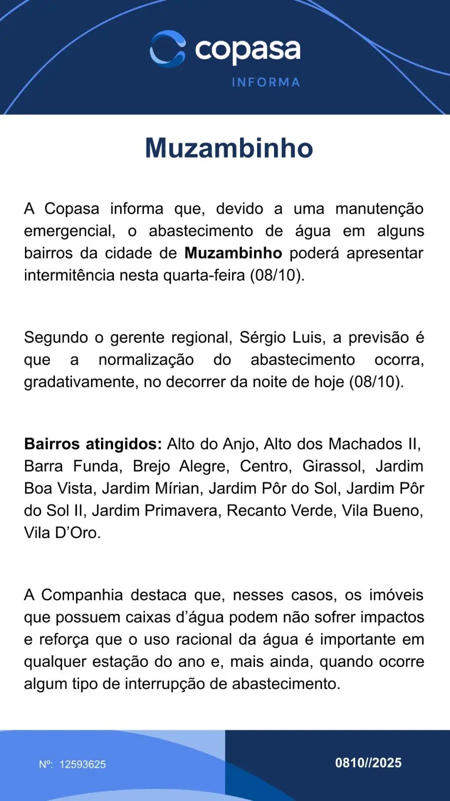 A Copasa informou que, devido a uma manutenção emergencial, o abastecimento de água em diversos bairros de Muzambinho poderá apresentar intermitência ao longo desta quarta-feira (08/10).