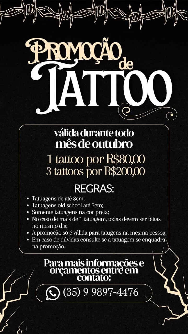 O mês de outubro chegou com tudo no Studio Daniel Tatuaria, em Muzambinho! E quem ama tattoo (ou está só esperando um bom motivo pra fazer a primeira) vai curtir essa: durante todo o mês, o estúdio está com uma promoção especial — 1 tatuagem por R$80 ou 3 tatuagens por R$200.