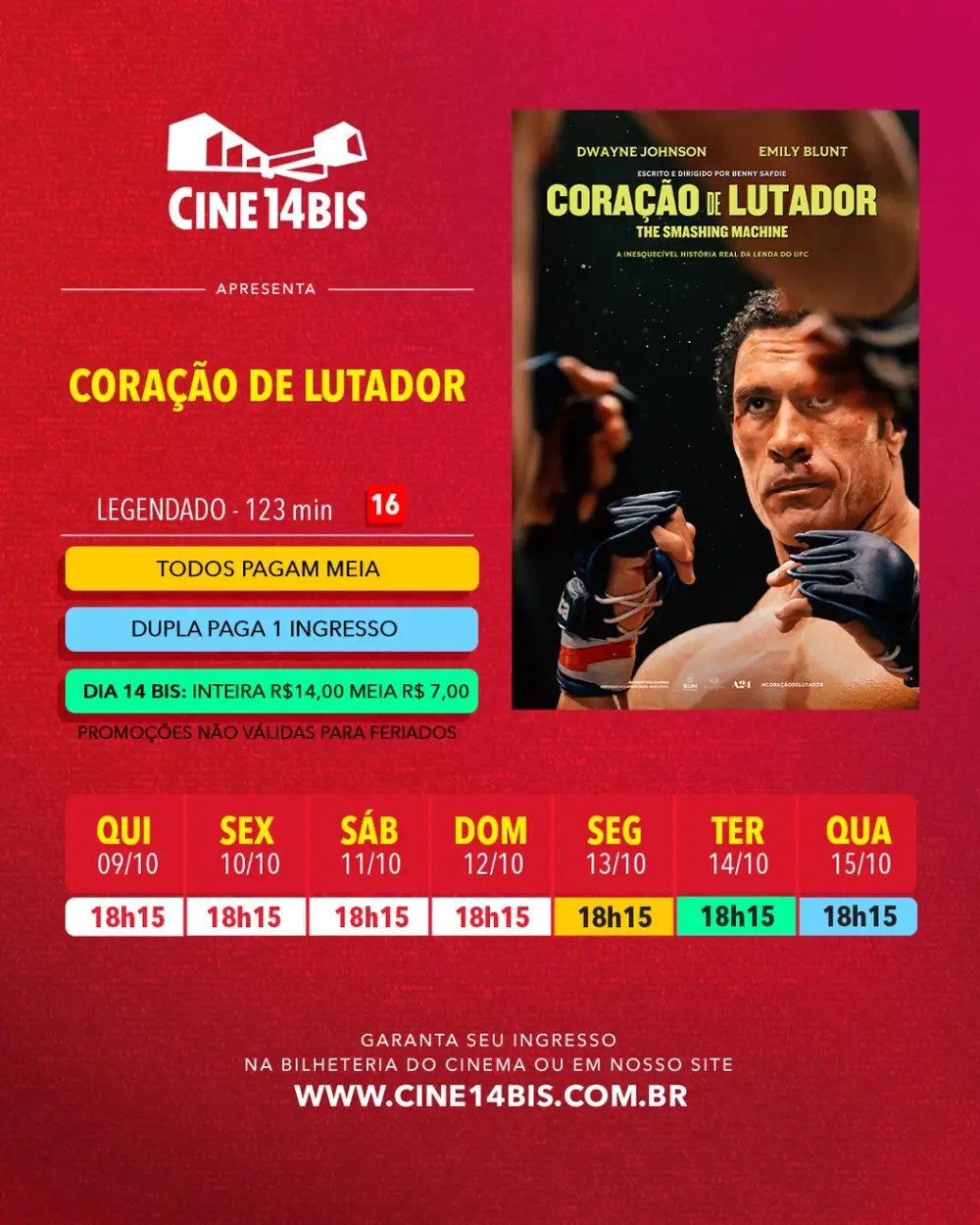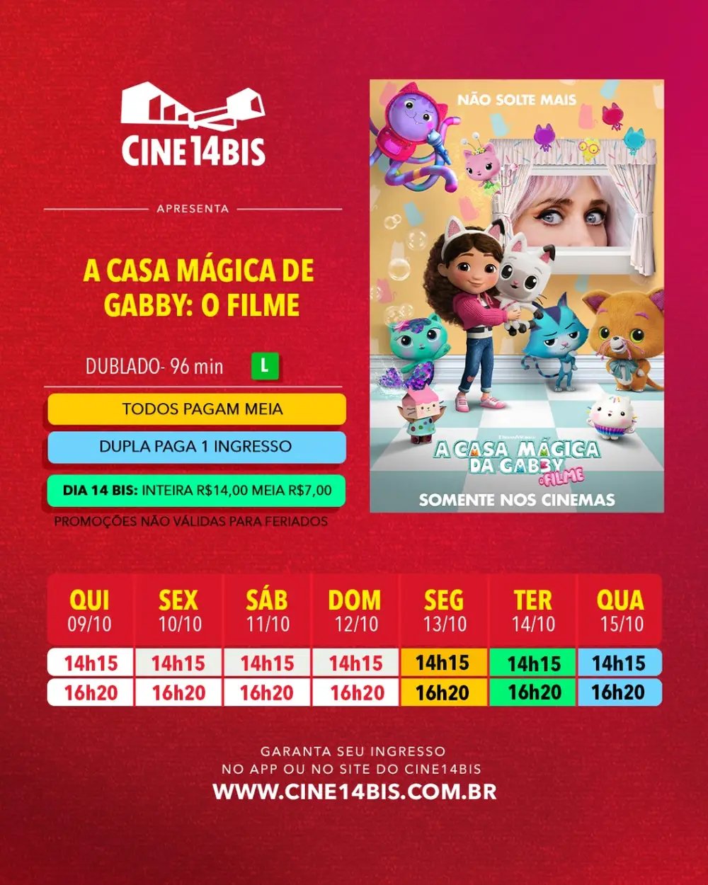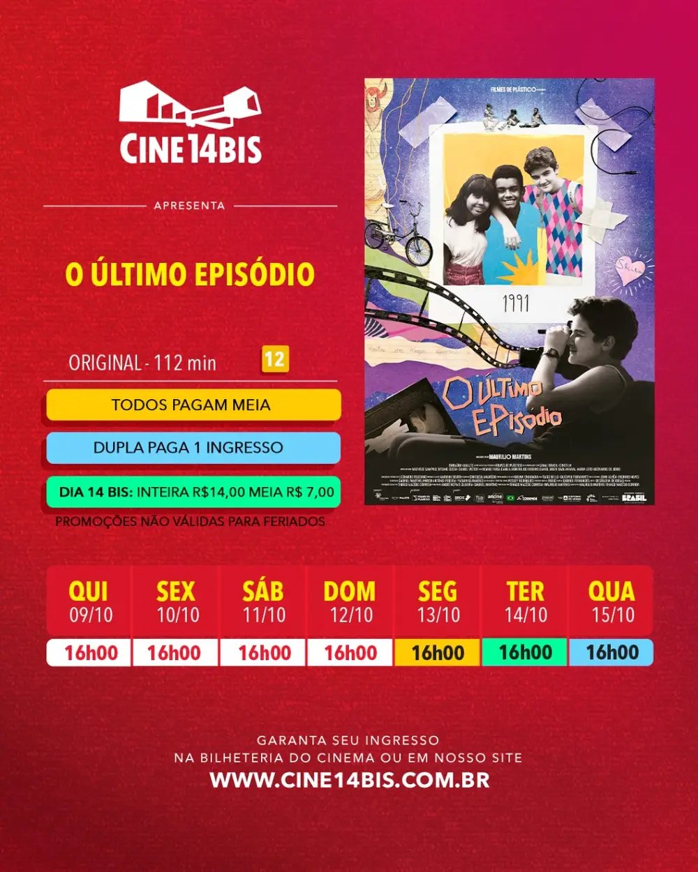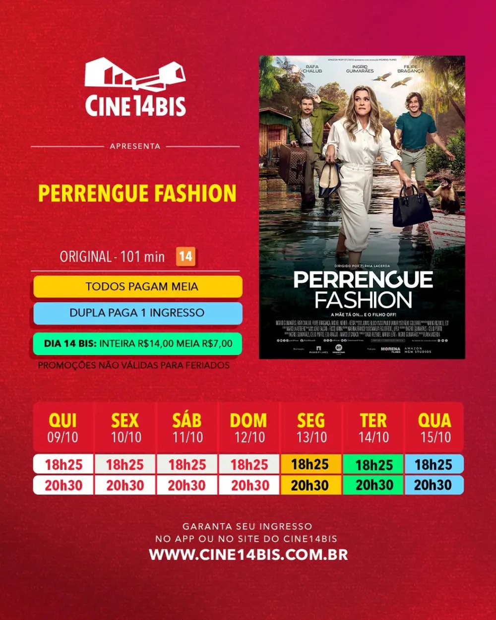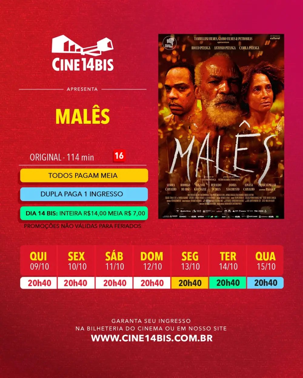 Na terça-feira, 14/10, o Cine14Bis realiza a ação Dia 14Bis: ingressos a R$ 14,00 (inteira) e R$ 7,00 (meia) em qualquer sessão do dia. A compra antecipada é recomendada para garantir lugar e evitar filas.