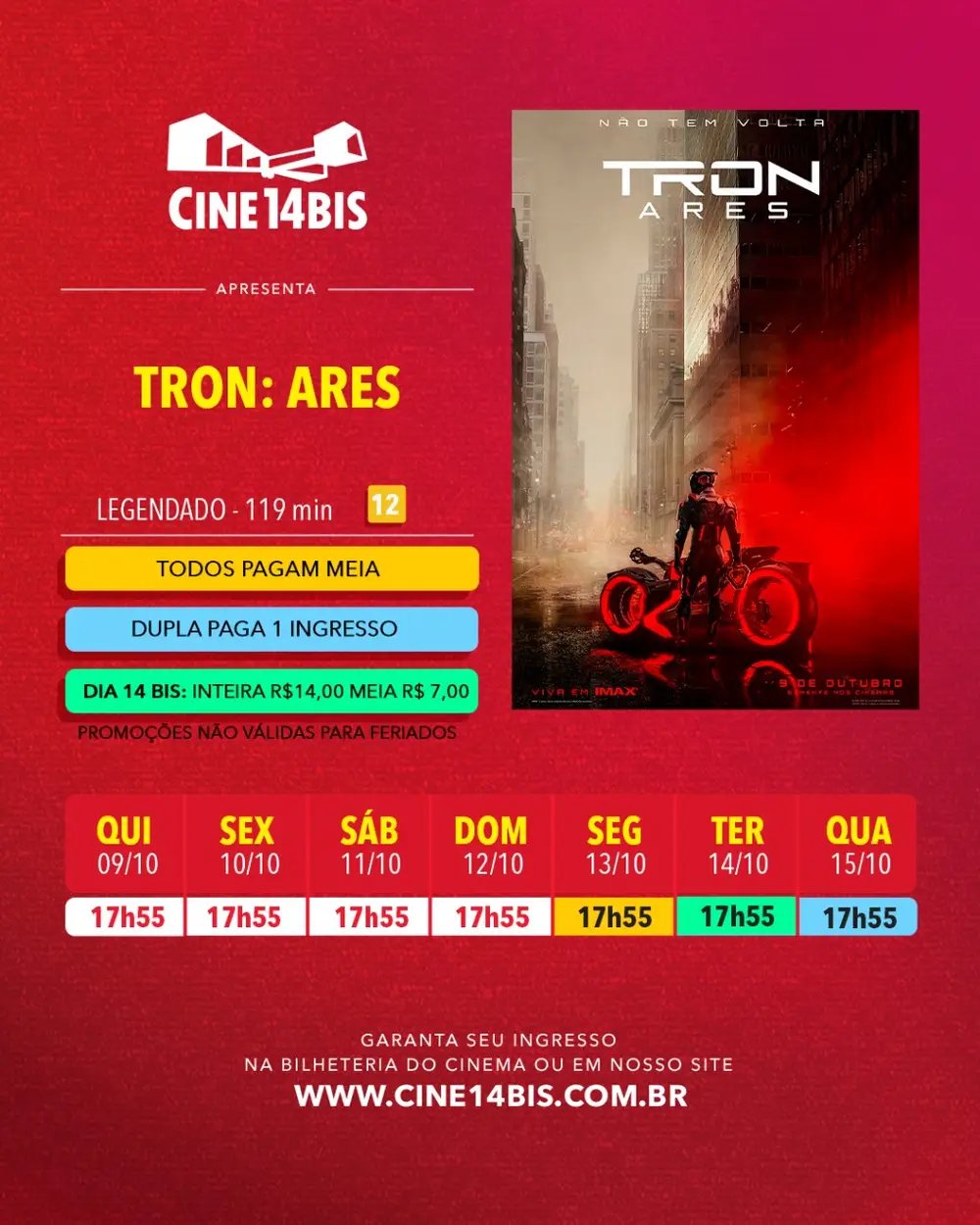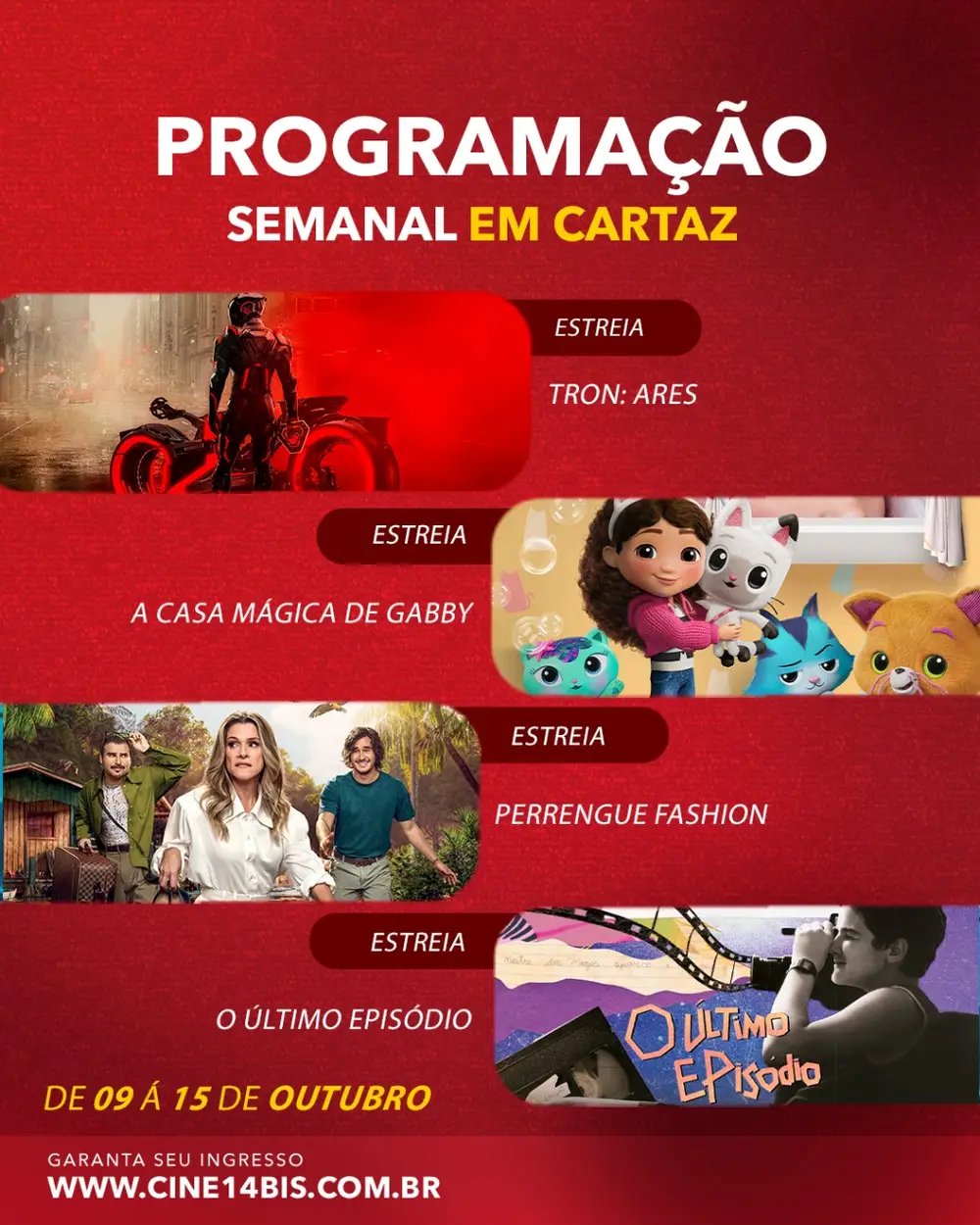 Além de TRON: Ares, permanecem em cartaz: A Casa Mágica da Gabby: O Filme, Perrengue Fashion, O Último Episódio e Coração de Lutador. A grade de horários completa e a venda de ingressos estão disponíveis no site e no app do Cine14Bis.