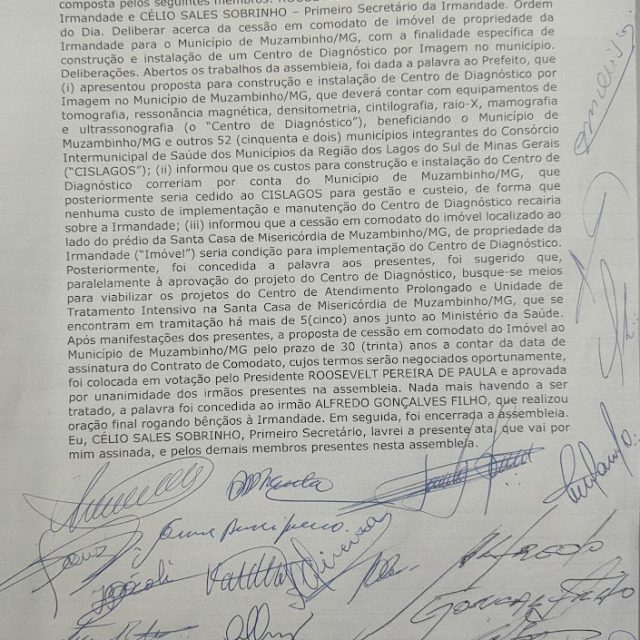 Ao final da deliberação, os membros da Irmandade da Santa Casa aprovaram a cessão do terreno pelo prazo de 30 anos, reafirmando o compromisso institucional com o desenvolvimento da saúde pública. A ata da reunião foi assinada por todos os presentes e registrada em cartório, consolidando oficialmente a decisão e o apoio unânime à iniciativa.