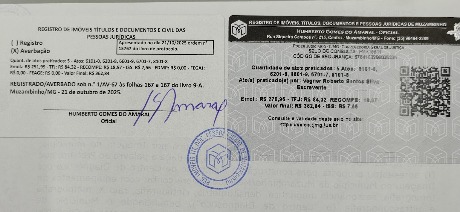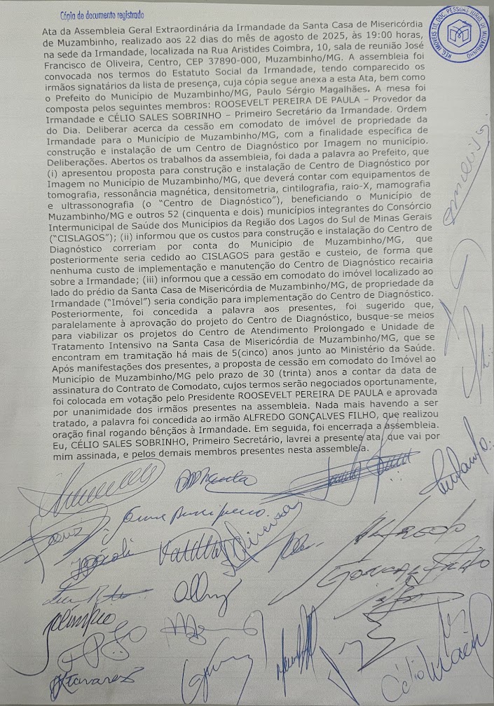 A Irmandade da Santa Casa de Muzambinho oficializou em cartório a ata da reunião extraordinária realizada em 22 de agosto de 2025, na qual foi aprovada por unanimidade a cessão de uso de um terreno para a implantação do Centro Regional de Imagens e Diagnósticos — considerado um dos maiores avanços recentes na área da saúde pública do município e de toda a região.