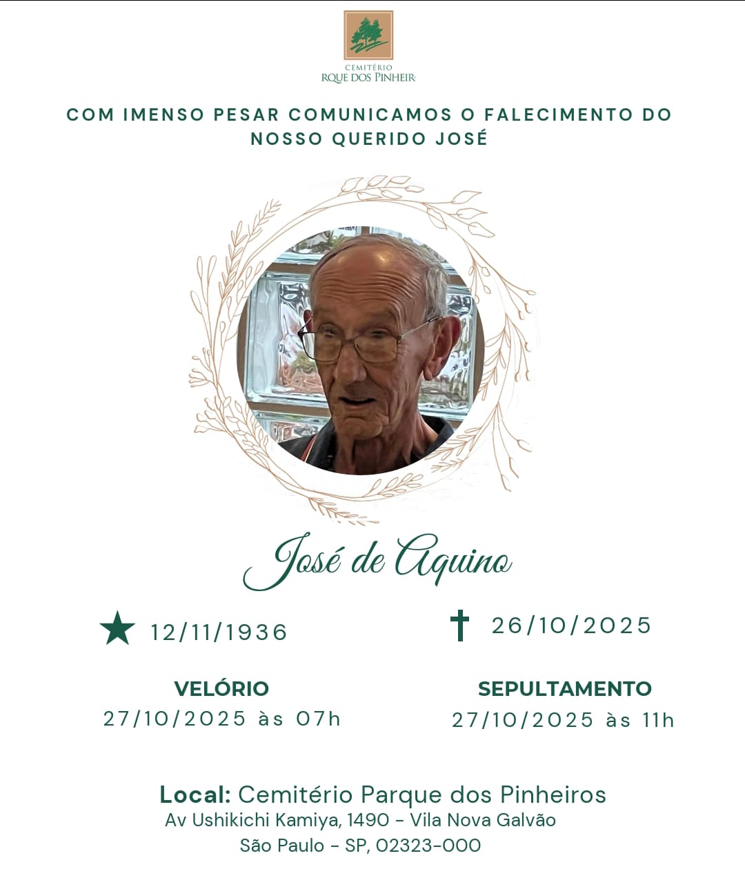 Mais Artigos DestaqueObituário Faleceu aos 67 anos o Sr. José Pedro de Melo DestaqueEsportesNossa Cidade O esporte vai tomar conta de Muzambinho com as Olimpíadas da SELCT DestaqueExecutivoNossa Cidade Atenção moradores: coleta de lixo muda nos feriados de fim de ano em MuzambinhoDestaqueObituárioFaleceu aos 89 anos o Sr. José de Aquino Redação27 de outubro de 20251min0Conhecido como Zé de Aquino, Filho da Geraldina Além Aquino e Claudionor de AquinoA família enlutada, nossos sinceros sentimentos de pesares, que Deus os abençoe e conforte. Post Views: 1.633EnterroFuneráriamorteobituárioSepultamentoVelório