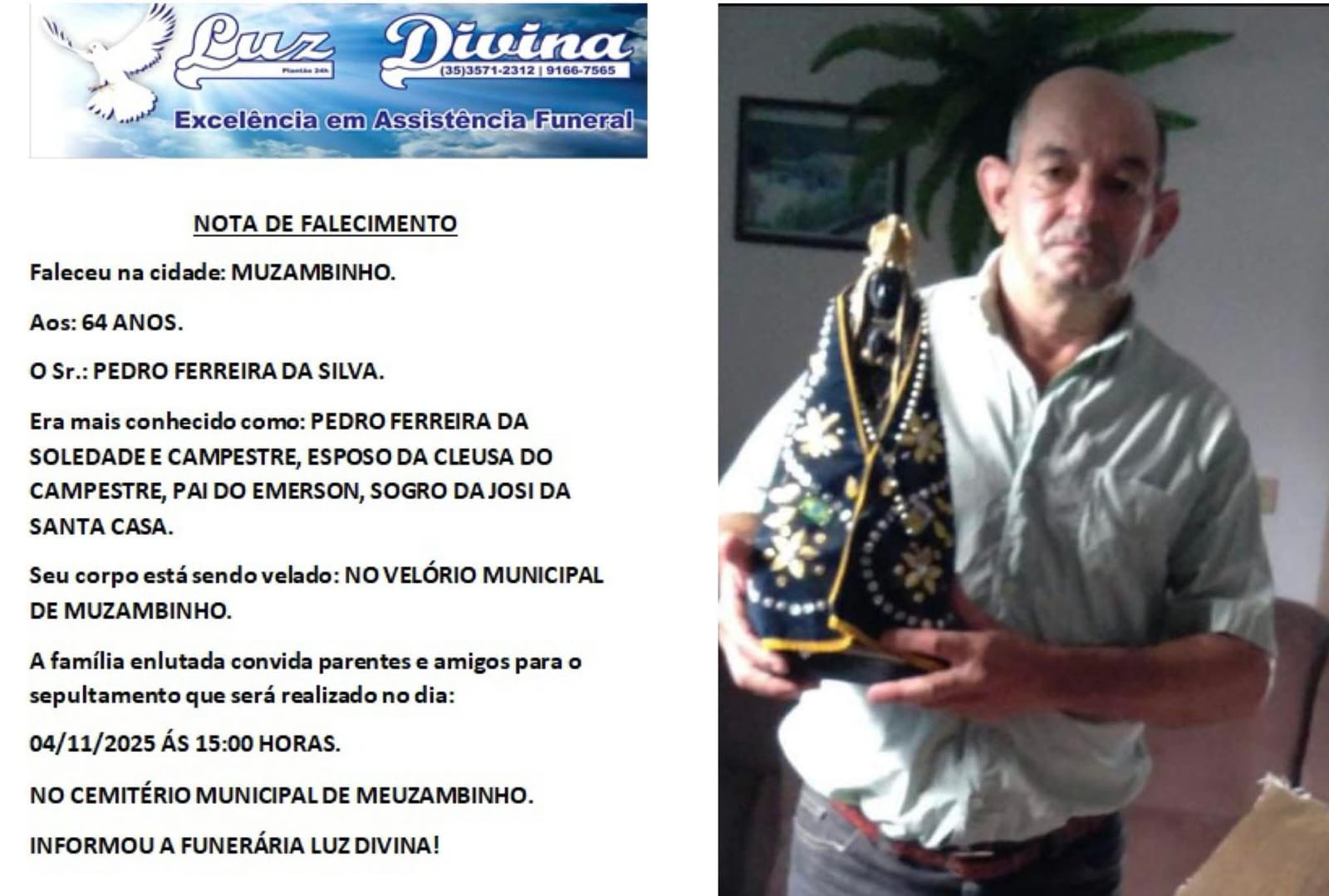 Mais Artigos DestaqueNossa Cidade Justiça Eleitoral de Muzambinho realiza busca ativa para cadastro da biometria DestaqueNossa CidadeSaúde Santa Casa de Muzambinho realizou 2.727 atendimentos no pronto-socorro em outubro DestaqueLegislativoNossa CidadePolítica Confira as falas da 38ª Reunião Ordinária de Vereadores em Muzambinho – 03/11/2025 DestaqueObituárioFaleceu aos 64 anos o Sr. Pedro Ferreira da Silva Redação4 de novembro de 20251min0Informou a Funerária Luz Divina A família enlutada, nossos sinceros sentimentos de pesares, que Deus os abençoe e conforte. Post Views: 1 EnterroFuneráriaLuz DivinamorteobituárioSepultamentoVelório