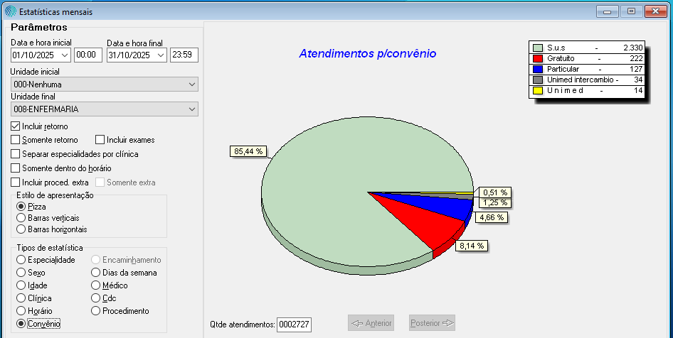 A maior parte dos atendimentos ocorreu por meio do Sistema Único de Saúde (SUS), com 2.330 registros, o que representa 85,4% do total. Além disso, foram contabilizados 227 atendimentos gratuitos e 177 particulares, além de convênios como Unimed Intercâmbio (34) e Unimed local (14).