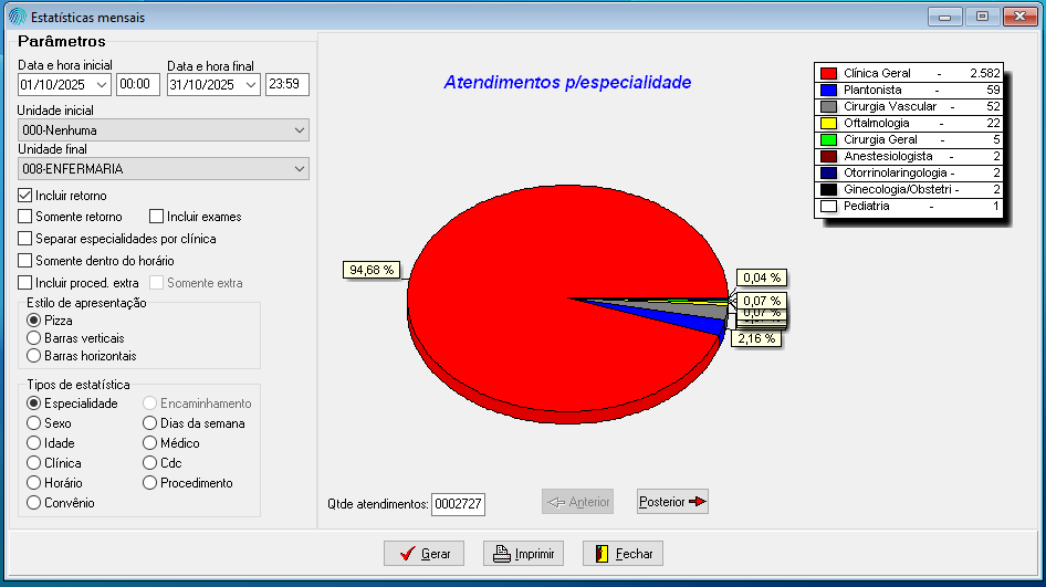 A Clínica Geral concentrou a quase totalidade dos atendimentos, com 2.582 casos (94,68%), seguida por Pediatria (4,7%), Ortopedia (52 casos), Ginecologia (19) e demais especialidades médicas com menor volume.