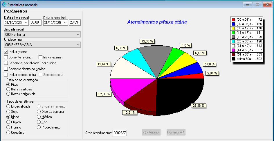 A análise por faixa etária mostra que o maior volume de atendimentos foi entre pessoas acima de 60 anos, com 618 registros (22,7%). Em seguida aparecem as faixas de 41 a 50 anos (333 atendimentos), 51 a 60 anos (335) e 26 a 30 anos (342). Crianças e adolescentes também tiveram presença significativa: de 0 a 12 anos foram 227 atendimentos.