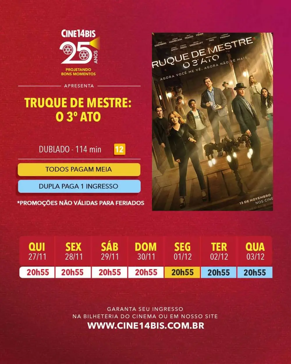 Mais Artigos DestaqueLegislativoNossa CidadeParceiros Ação de Doação de Sangue mobiliza comunidade em Muzambinho nesta sexta-feira DestaqueExecutivoNossa Cidade Prefeito Paulinho convida população para celebrar os 145 anos de Muzambinho DestaqueDiversosNosso EstadoParceiros PRÓ-MANANCIAIS: ÁGUA QUE BROTA, VIDA QUE NASCE. DestaqueLazerParceirosCine14Bis: Confira a Programação Semanal Redação28 de novembro de 20252min0A nova programação do Cine14Bis já está no ar! Garanta seu ingresso no app e viva a experiência www.cine14bis.com.br Rua Marcelino Rivera, 007 – Guaxupé/MG Programação Post Views: 3 cinemaentretenimentoGuaxupé
