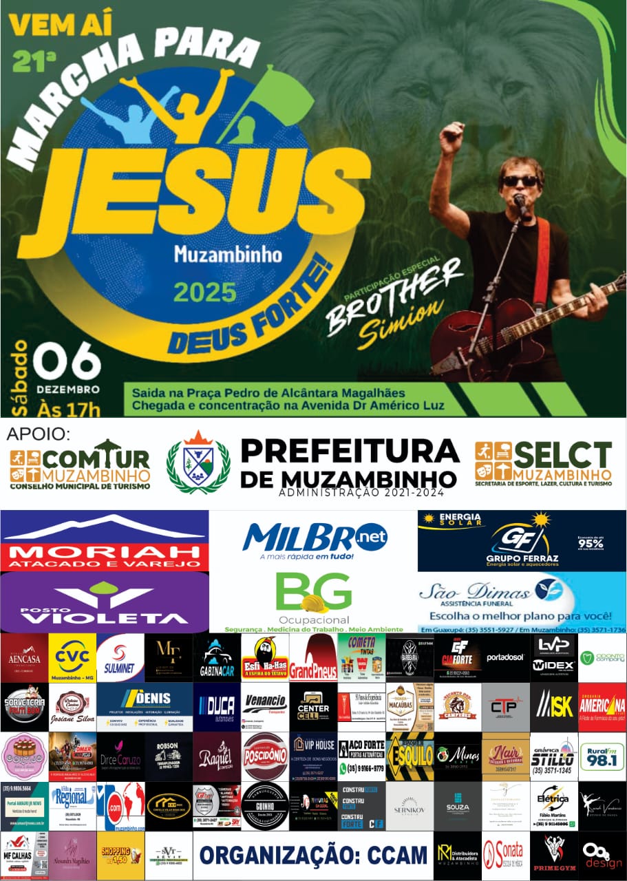 Mesmo diante de desafios, a 21ª edição da Marcha para Jesus será realizada em Muzambinho no próximo dia 6 de dezembro, um sábado, com concentração marcada para as 17h. O evento, que já faz parte do calendário anual da cidade, tem como tema deste ano “Deus Forte” e promete reunir centenas de pessoas em um momento de união, adoração e celebração da fé cristã.