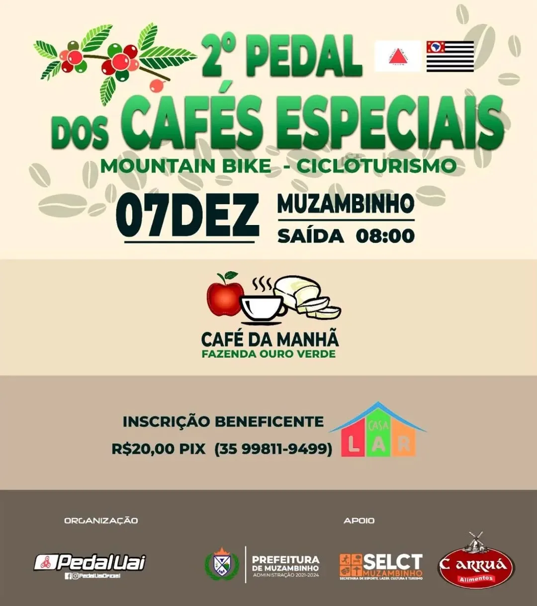 A cidade de Muzambinho se prepara para mais uma celebração do ciclismo solidário. No próximo domingo, 7 de dezembro, acontece o 2º Pedal dos Cafés Especiais, evento que promete movimentar atletas, famílias e apaixonados pelo pedal em uma manhã marcada por esporte, natureza e solidariedade.