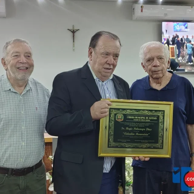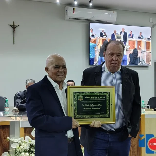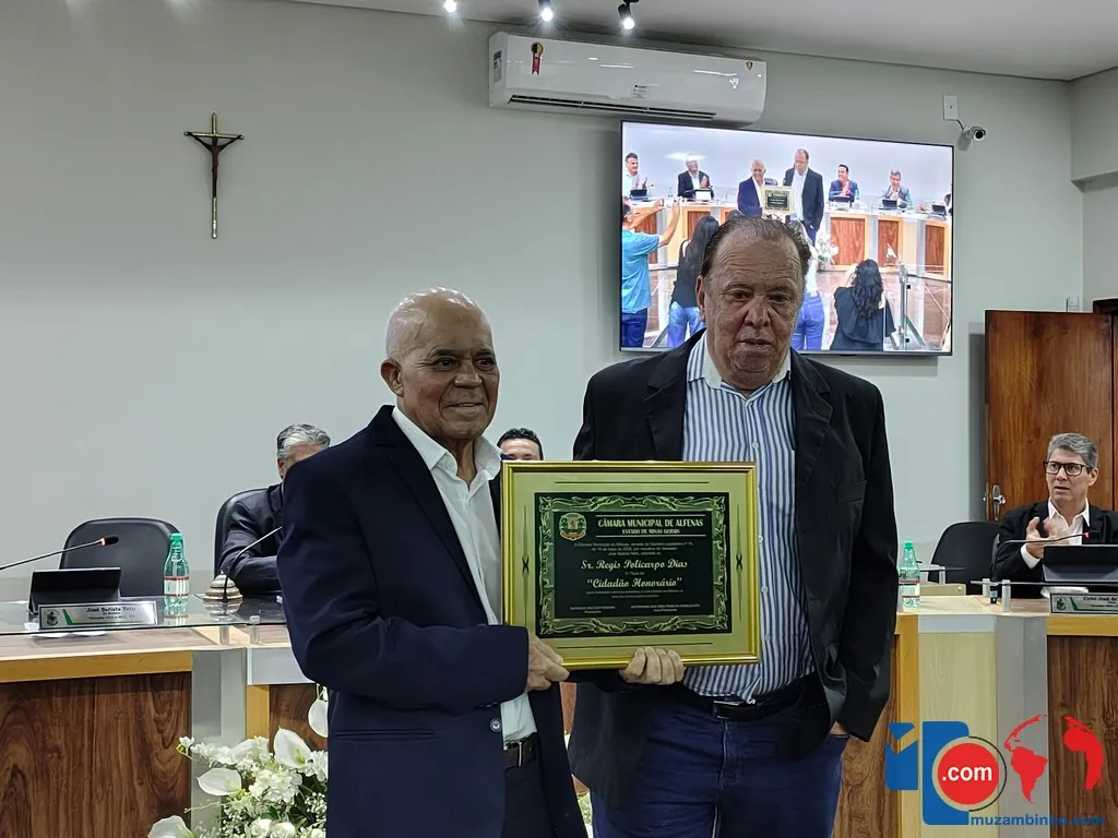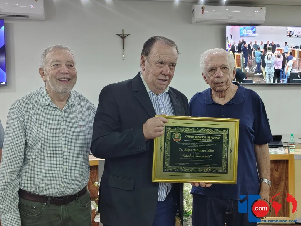 O muzambinhense Regis Policarpo Dias recebeu na última sexta-feira, 05/12, em sessão solene realizada pela Câmara Municipal de Alfenas, o Título de Cidadão Alfenense, honraria concedida em reconhecimento aos serviços prestados pelo comunicador à comunidade local. A iniciativa foi aprovada por unanimidade pelos vereadores, que destacaram a contribuição do radialista para o diálogo e a transparência na administração pública.