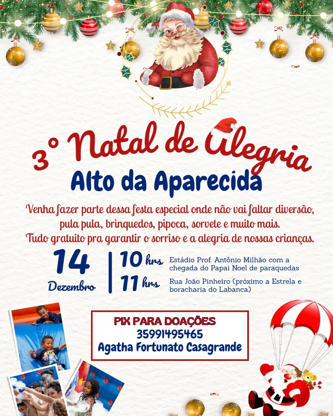 O Alto da Aparecida se prepara para viver um domingo inesquecível. Neste dia 14 de dezembro, Muzambinho receberá o 3º Natal da Alegria, uma celebração marcada por encanto, união e muita emoção, preparada com carinho para todas as famílias da comunidade.