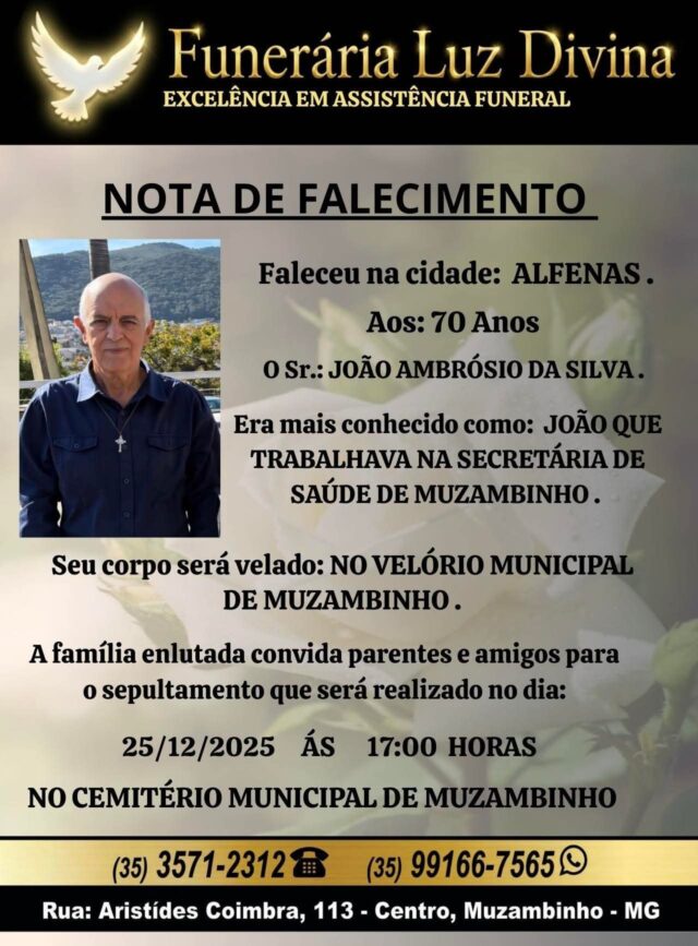Mais Artigos DestaqueNossa CidadeParceirosSaúde A Importância do lar na Qualidade de Vida familiar DestaqueEsportesNossa CidadeParceiros Esportistas de Muzambinho são homenageados com a Comenda José Octaviano Sales Cozinha e CulináriaDestaqueNossa CidadeParceiros Sábado especial em Muzambinho: almoço irresistível e música ao vivo no Bar do EdmarDestaqueObituárioFaleceu aos 70 anos o Sr. João Ambrósio da Silva Redação25 de dezembro de 20251min0Informou a Funerária Luz DivinaA família enlutada, nossos sinceros sentimentos de pesares, que Deus os abençoe e conforte. Post Views: 278EnterroFuneráriaLuz DivinamorteobituárioSepultamentoVelório