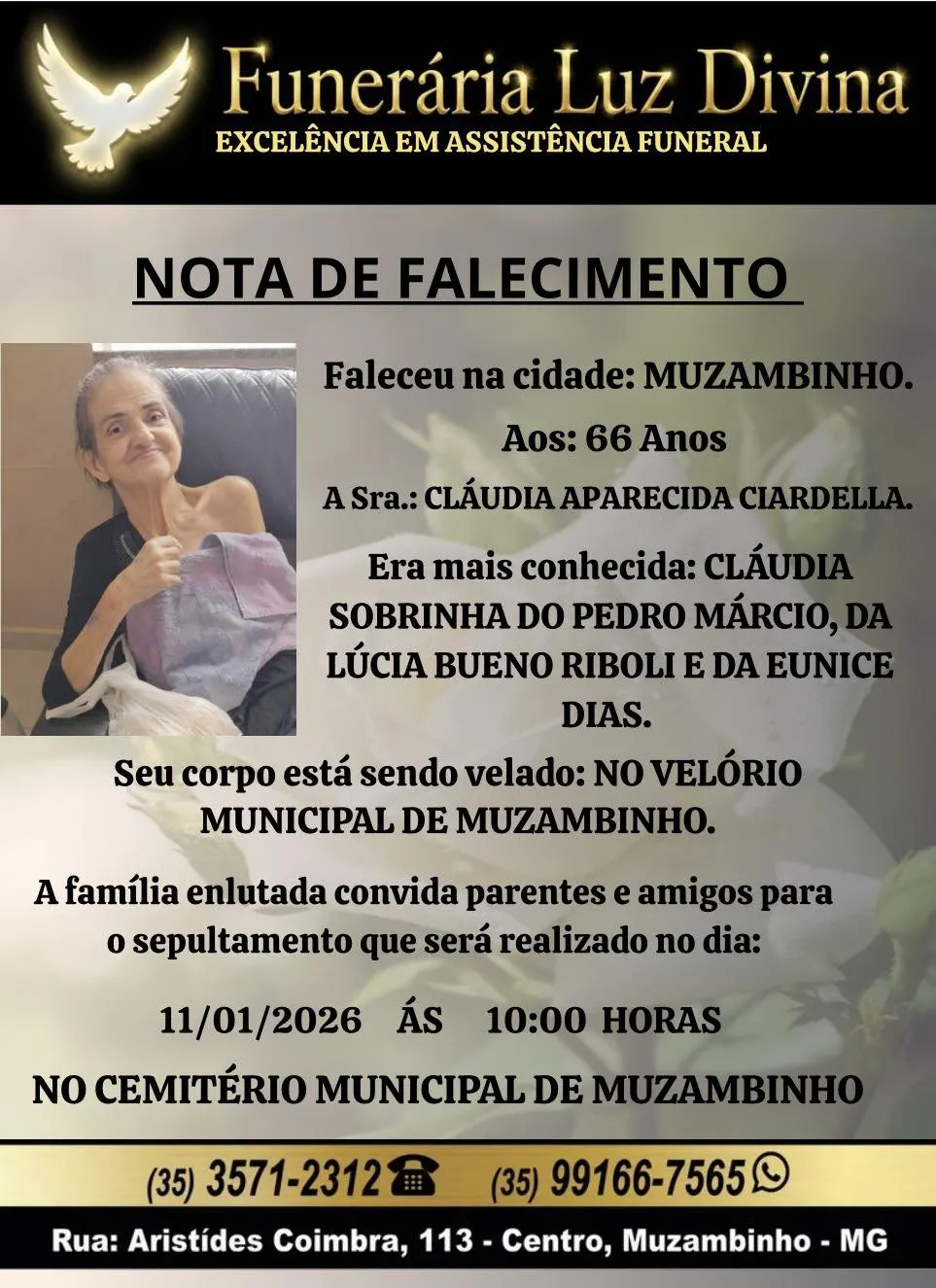 Mais Artigos Cozinha e CulináriaDestaqueNossa CidadeParceiros Final de Semana com as Deliciosas Pizzas da Pizzaria LaDiLá! Cozinha e CulináriaDestaqueNossa CidadeParceiros As melhores lembranças das férias… AgronegócioDestaque Café em Foco, 09/01/26, Cotações e Informações da CafeiculturaDestaqueObituárioFaleceu aos 66 anos a Sra. Cláudia Aparecida Ciardella Redação10 de janeiro de 20261min0Informou a Funerária Luz DivinaA família enlutada, nossos sinceros sentimentos de pesares, que Deus os abençoe e conforte. Post Views: 33EnterroFuneráriaLuz DivinamorteobituárioSepultamentoVelório
