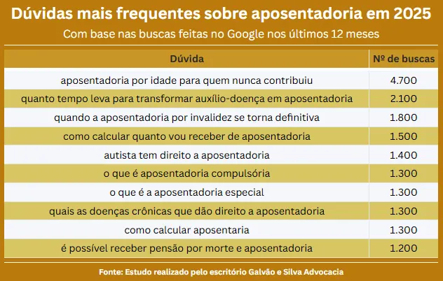 Segundo o estudo, as buscas pelo termo “aposentadoria” cresceram 84,91% em 2025, em comparação com 2024, ultrapassando 3 milhões de pesquisas anuais.