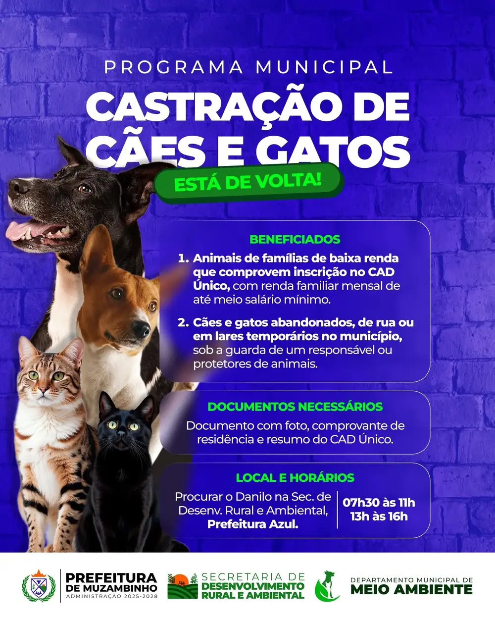 A Prefeitura de Muzambinho retoma, a partir da próxima segunda-feira (2 de fevereiro), o Programa Municipal de Castração e Microchipagem de Cães e Gatos, uma importante ação voltada ao controle populacional e à promoção do bem-estar animal no município. O serviço é coordenado pela Secretaria de Desenvolvimento Rural e Ambiental, em parceria com o Departamento Municipal de Meio Ambiente.