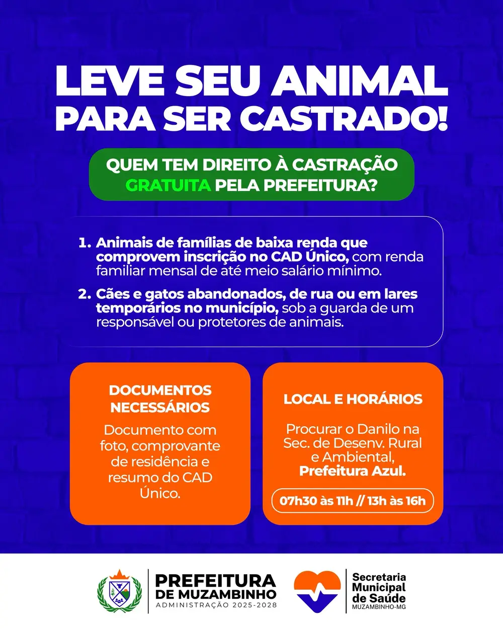 A orientação da prefeitura é que os tutores que se enquadram nos critérios procurem o serviço e façam o cadastro, contribuindo para o controle populacional e para uma cidade com mais saúde e respeito aos animais.
