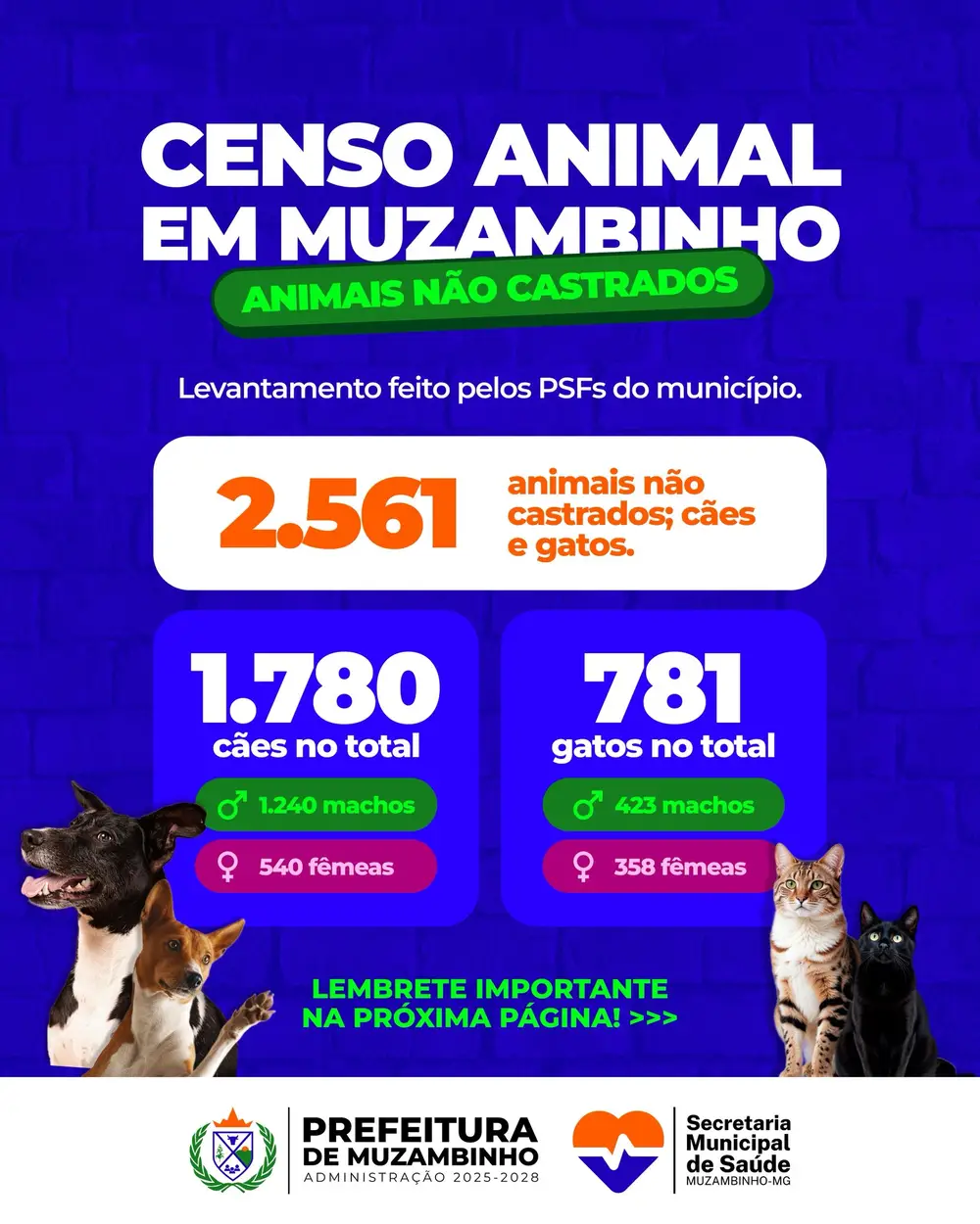 A Prefeitura de Muzambinho, por meio da Secretaria Municipal de Saúde, divulgou os resultados do Censo Animal realizado no município, com foco em identificar cães e gatos que ainda não foram castrados. O levantamento, feito pelas equipes das Unidades de Saúde da Família (PSF), contabilizou 2.561 animais não castrados, sendo 1.780 cães e 781 gatos.