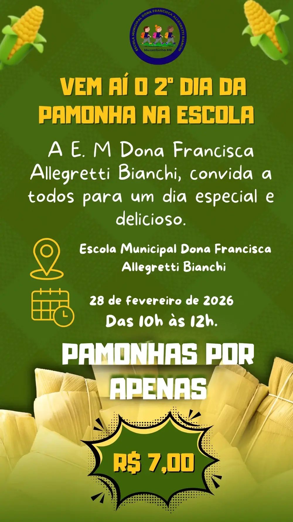 A Escola Municipal Dona Francisca Allegretti Bianchi, em Muzambinho, promove no próximo dia 28 de fevereiro de 2026 o 2º Dia da Pamonha na Escola. A ação será realizada das 10h às 12h, com retirada das encomendas diretamente na unidade escolar.