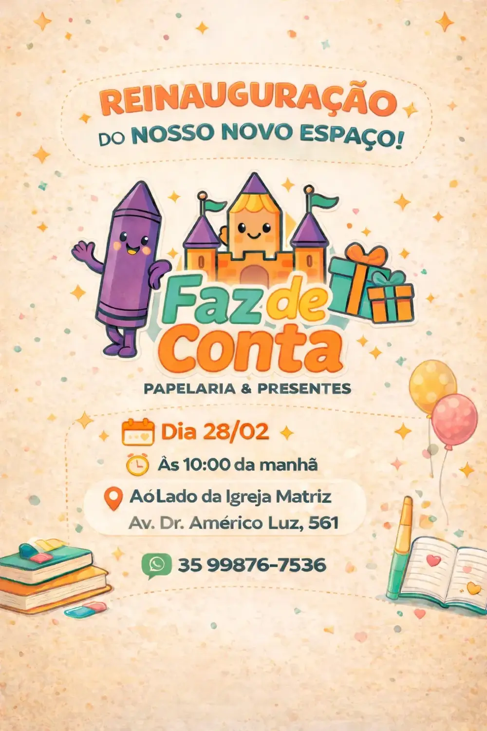 A Faz de Conta Papelaria & Presentes realiza neste sábado, dia 28 de fevereiro, a reinauguração do seu novo espaço em Muzambinho. A abertura oficial acontece às 10h da manhã, em um ambiente totalmente renovado para melhor atender a população.